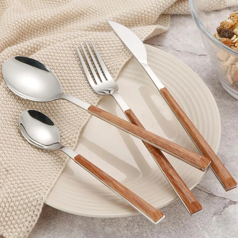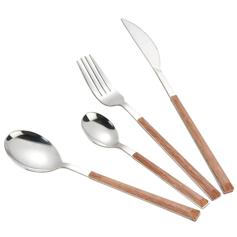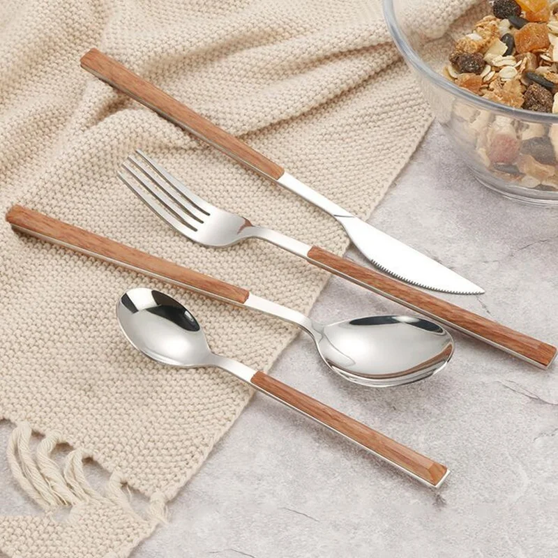 Набор столовых приборов из нержавеющей стали 304, 24 шт., серебряные столовые приборы наборов глянцевых деревянных ножей, вилок, чайных ложек, столовых приборов