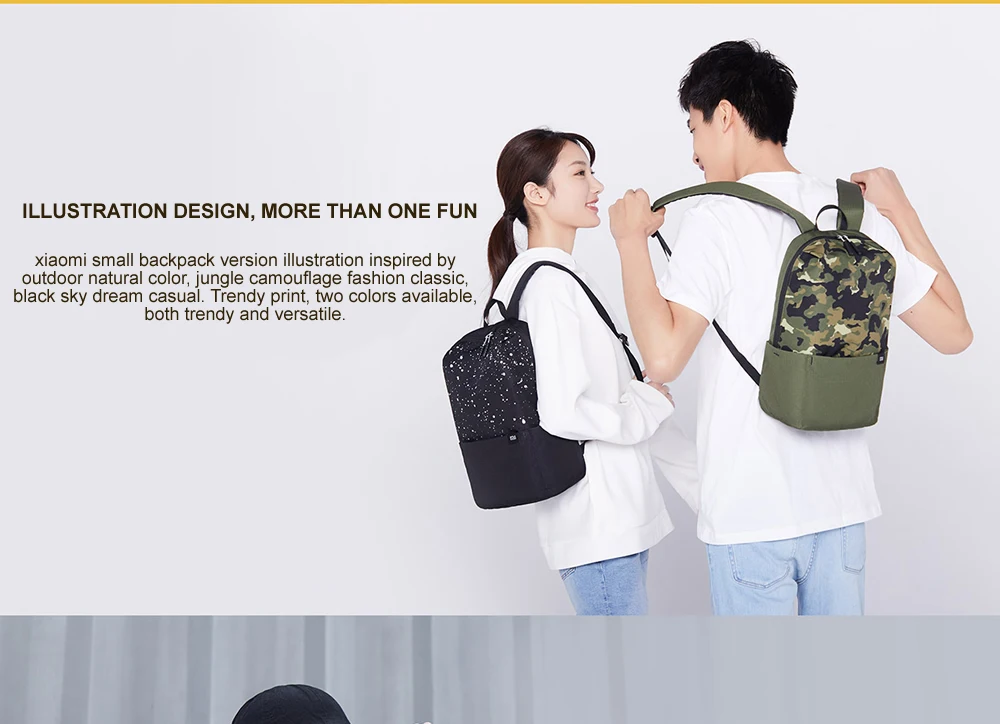 Название продукта: маленький рюкзак Xiaomi Цвет изделия: Звездное небо/Камуфляж Размер изделия: 340 × 225 × 130 мм Материал изделия: полиэфирное волокно Вес нетто: 157 г Объем продукта: 10 л * Изображение только для справки. Фактический продукт должен превалировать. Из-за влияния на светильник может быть определенная разница в цвете от фактического продукта.
