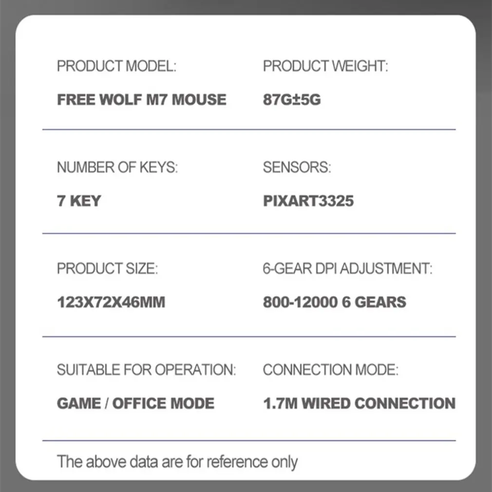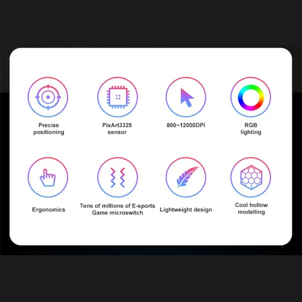 Особенности[Ультра-светильник mouse] Этот светильник с весовой игровой мышью использует светильник с весовым сотовым корпусом и ультра-светильник, а также сверхтканый кабель. Они обеспечивают вентиляцию, чтобы ладони были прохладными и свежими. Легко чистить мышь, просто используйте воздух для поддержания качества мыши.[12000 DPI Регулируемая игровая мышь] Проводная профессиональная игровая мышь использует жесткий чип, высокоточный оптический датчик, до 12000 dpi (уровень 6/editable), может выдерживать Ускорение 20g, И имеет жизнь 50 миллионов ключей. Высокопроизводительная конфигурация мыши может удовлетворить ваши потребности для быстрого просмотра веб-страниц и игр.[10 RGB мышь с подсветкой] RGB игровая мышь с подсветкой имеет 1,68 млрд RGB streamer волшебный Светильник цвета эффекта, принося отличные визуальные эффекты. Он может выбрать 26 эффектов подсветки через драйвер. Каждый эффект подсветки имеет различное великолепное освещение, которое может удовлетворить ваши различные потребности в освещении игры и создать конкурентную атмосферу игры.[Эргономичный дизайн] Уникальный эргономичный дизайн мыши может эффективно уменьшить болезненность запястья после длительного использования. Предназначен для обеспечения плавного движения и уменьшения общей усталости.Описание:[Подключи и играй и Совместимая система] Эта Проводная usb-мышь подключена через интерфейс USB, подключи и работай. Мышь использует высокопроизводительный основной чип управления, чтобы гарантировать, что мышь находится в сверхвысокоточном состоянии в течение длительного времени, И он совместим с Windows 2000 / XP / VISTA / 7/8/10 и MAC.Технические характеристики:Материал: пластикРазмеры: 123X72X46MMИнтерфейс USBДлина лески 1,7 (метров)Количество клавиш 7 (ключи)Изменяемое разрешение шесть передачОптическое разрешение 12000 (dpi)Посылка включает в себя:1 * коврик для мышиПримечания:1. Из-за разницы между различными мониторами изображение может не отражать фактический цвет изделия. Мы гарантируем, что модель реального изделия не отличается от представленной на фото.2. Возможны незначительные отклонения в размерах из-за различных измерений вручную.