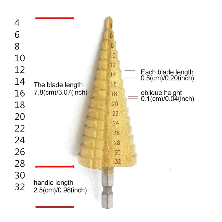 Описание:1. Материал: сталь HSS2. Цвет: Золотой3. Обработка поверхности: титановое покрытие4. Размер (прибл.):4-12 мм Длина: 6,7 см4-20 мм Длина: 7,4 см4-32 мм Длина: 10,2 смОсобенности:1. Тип сверла доступен в трех размерах 4-32 мм, 4-20 мм, 4-12 мм.2. Подходит для резки отверстий из различных материалов, включая сталь, бронзу, алюминий и так далее.3. Ступенчатый титановый нож с титановым покрытием из быстрорежущей стали, прочный, износостойкий и долговечный.4. Поверхность покрыта титаном, чтобы уменьшить трение и тепло, что нелегко сломать по сравнению с обычными сверлами.5. Он надежно помещается в патрон электроинструмента и устраняет проскальзывание, а также быстрее удаляет чипы и позволяет частицам легко удаляться