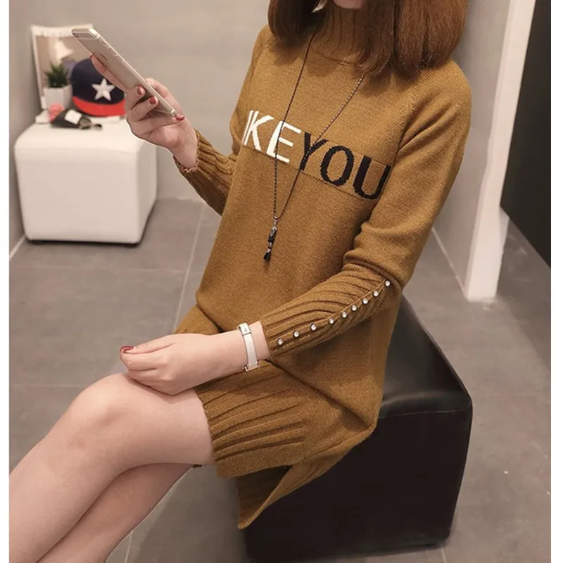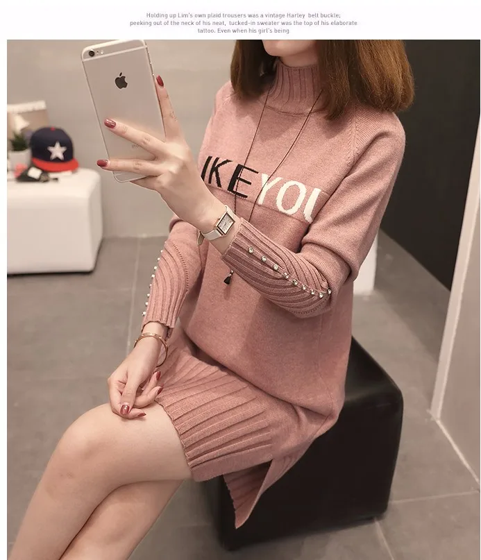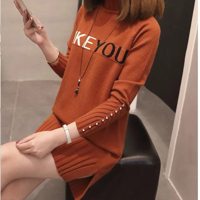 Осенне-зимний длинный вязаный свитер, пуловер, Женская водолазка с длинным рукавом и бусинами, свободный женский свитер