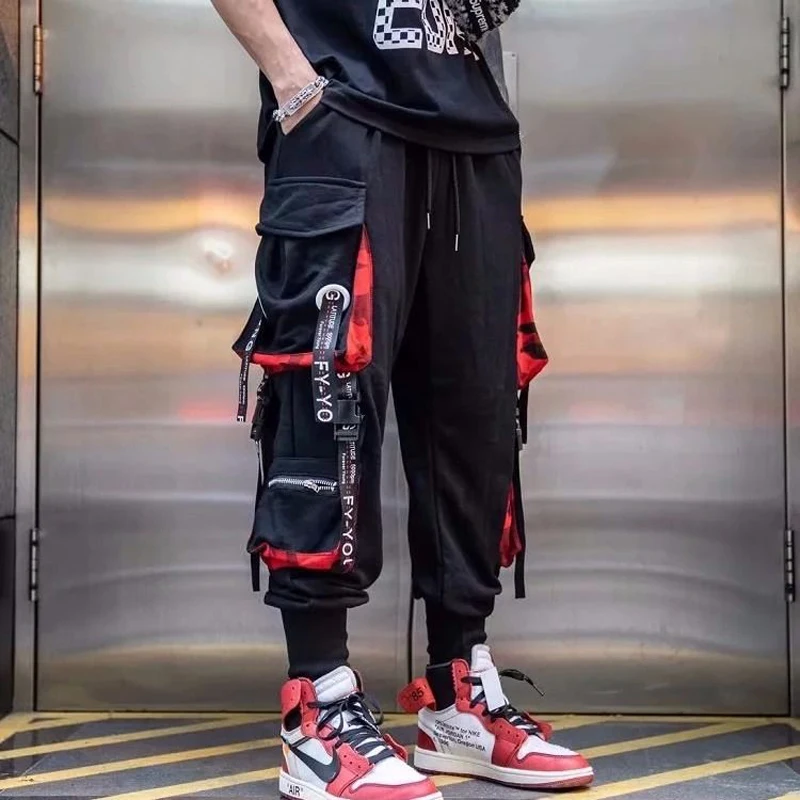 Брюки-карго мужские, хип-хоп, черные, спортивные, с лентами