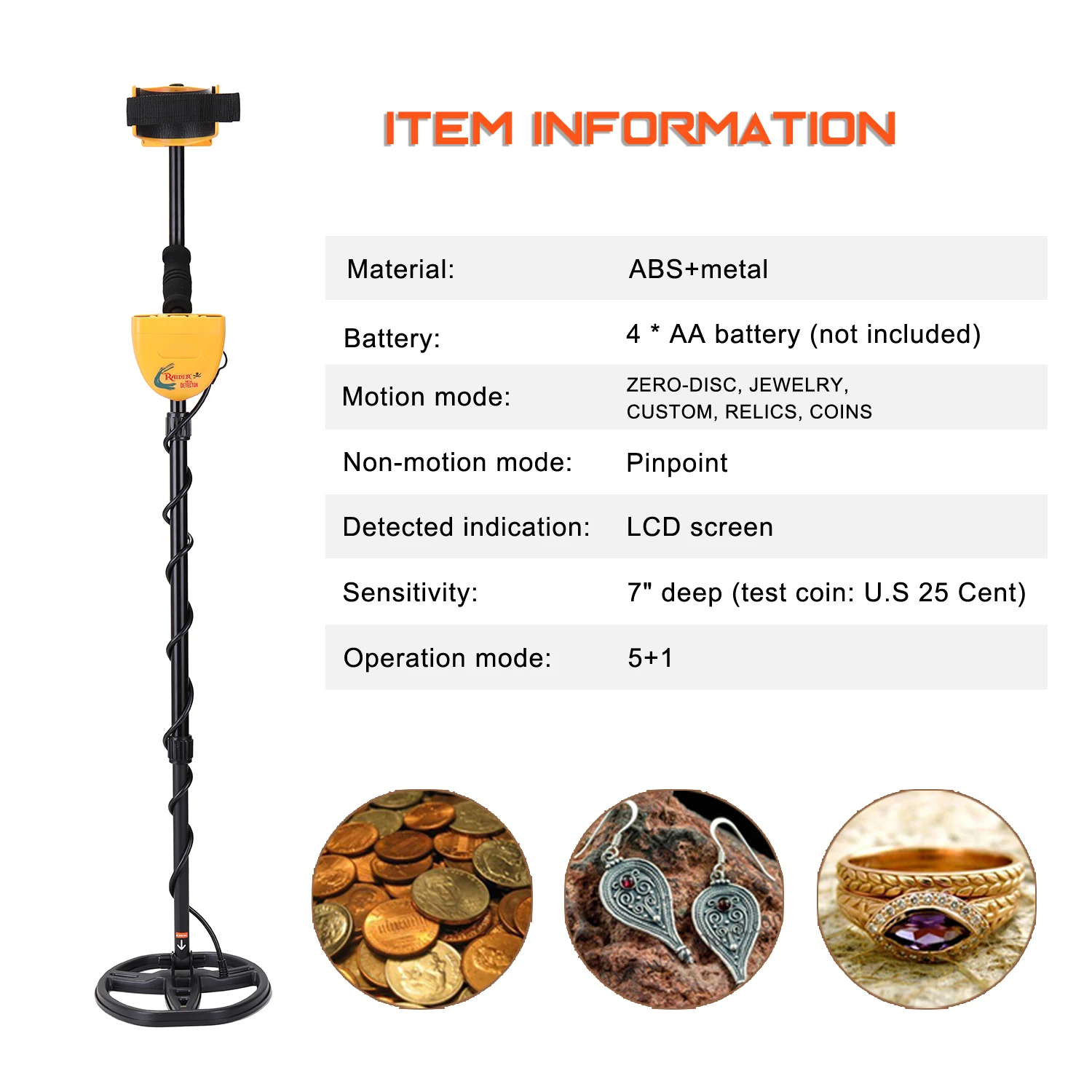 С помощью металлоискателя вы можете охотиться за монетами, реликвиями, ювелирными изделиями, золотом и серебром где угодно, включая газоны, снег, горы и т. д. Детектор обладает высокой чувствительностью и высокой способностью к дискриминации. Он универсален и прост в использовании. Особенности: ЖК-дисплей и подсветка: Большой ЖК-Дисплей четкий, а функция подсветки позволяет использовать его ночью или в темноте. Водонепроницаемая поисковая катушка: водонепроницаемая защита, с помощью этого металлоискателя вы можете найти металлические предметы на мелководье или на морском пляже. Регулируемая высота: детектор можно установить на самую удобную высоту, регулируемая длина подходит для детей и взрослых. 5 режимов переключения: режим нулевого диска, режим ювелирных изделий, пользовательский режим, режим монет и режим монет. Определение точки: точное определение точки обеспечивает быстрое восстановление с минимальным отверстием. Характеристики: Материал: АБС-пластик + металл Цвет: черный Тип: 1-2 (необязательно) Тип 1: металлоискатель Тип 2: металлоискатель + лопатка Батарея: 4 батарейки AA (не входят в комплект) Режим работы: 5 + 1 Режим движения: нулевой диск, ювелирные изделия, на заказ, реликвии, монеты Режим без движения: точечный Индикация обнаружения: ЖК-экран Чувствительность: Глубина 7 дюймов (тестовая Монета: 25 долларов США) Размер поисковой катушки: 288*222 мм/11,3 * дюйма Посылка: 540*360*145 мм/21,3*14,2 * 5.7in Вес посылка: Тип 1: 2072 г/фунта Тип 2: 2475 г/фунта Примечание: Поисковая катушка водонепроницаема, но корпус управления не является водонепроницаемым. Комплектация: (необязательно) Тип 1: 1 * Основной блок металлоискателя 1 Катушка обнаружения 2 шатуна 1 * подлокотник 1 * Защитный чехол для хоста 2 шайбы 1 * Руководство пользователя Или Тип 2: 1 * Основной блок металлоискателя 1 Катушка обнаружения 2 шатуна 1 * подлокотник 1 * Защитный чехол для хоста 2 шайбы 1 * Лопата 1 * Руководство пользователя