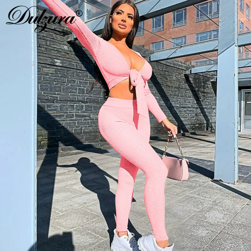Женский комплект из двух предметов в рубчик Dulzura, укороченный топ с бантом и V-образным вырезом, леггинсы с длинным рукавом, уличное боди, соблазнительные осенне-зимние комбинации