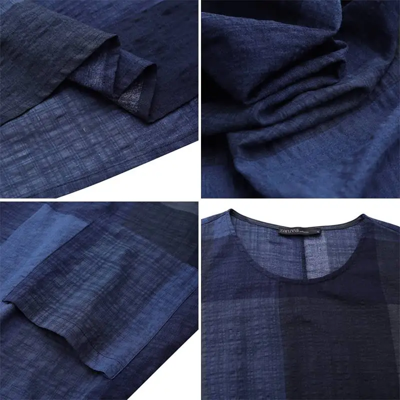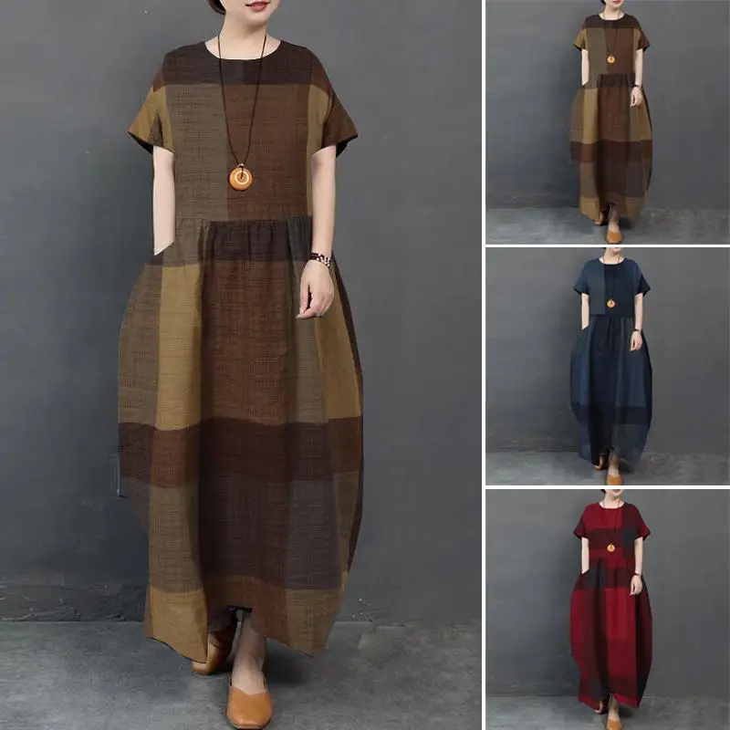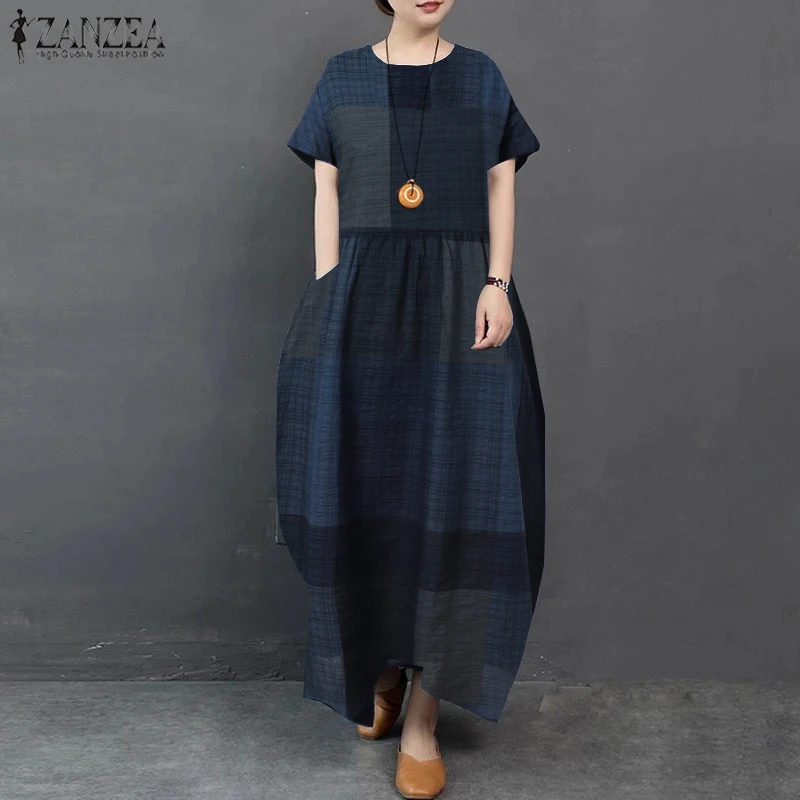 Женский винтажный сарафан в клетку ZANZEA, повседневное длинное платье с коротким рукавом и круглым вырезом, модель 7 на лето, 2021