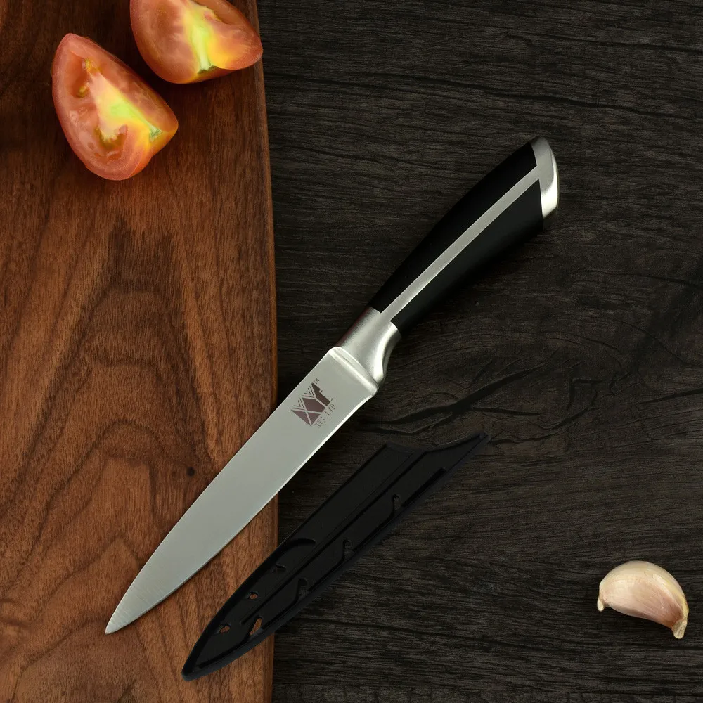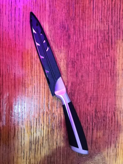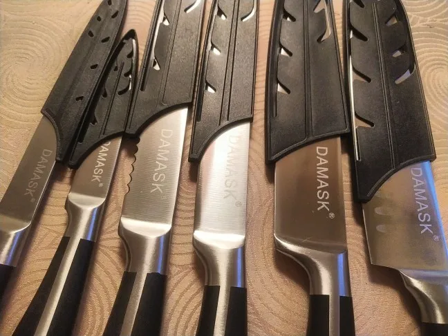 Качество доставленных ножей так себе, мало того что прислали не то что заказывал (я так понимаю более дешёвая замена для доставки из России "DAMASK") так ещё и один нож с браком ( был спор, вернули половину стоимости), кроме того и покраска ручек (черный цвет) с некоторыми косяками. Короче за 800 руб (что я в результате заплатил после спора) -ножы более менее они более того не стоят. Острые., легче чем обычные ножи, сталь легко точиться., соответственно думаю тупится будет быстрее.