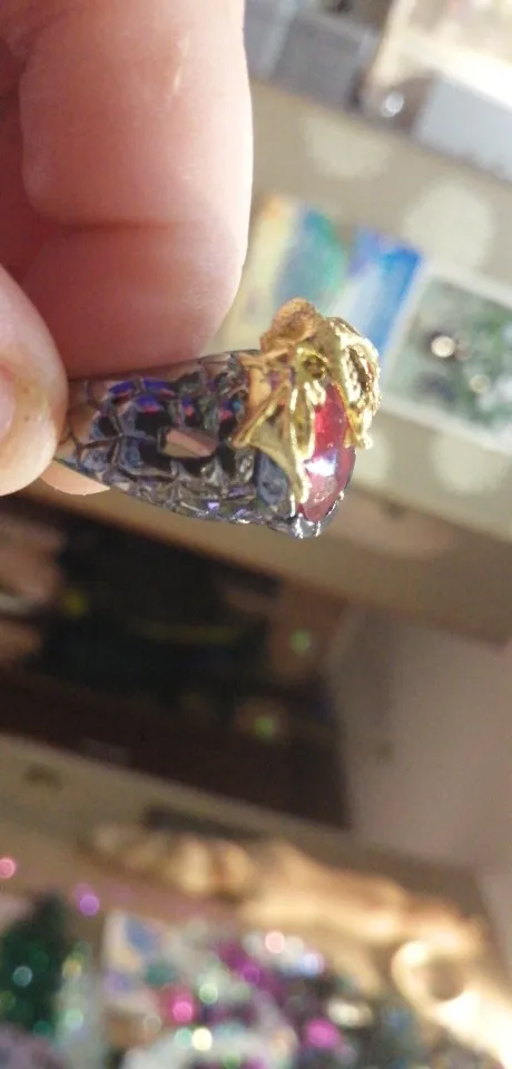 Ребята замечательное кольцо, чудесный дракон на ограде башни, это просто сказка!!! Метал оправы темного цвета, не почернеет и не облезет, детали дракончика хорошо проработанны. Я довольна, спасибо большое продавцу!!!