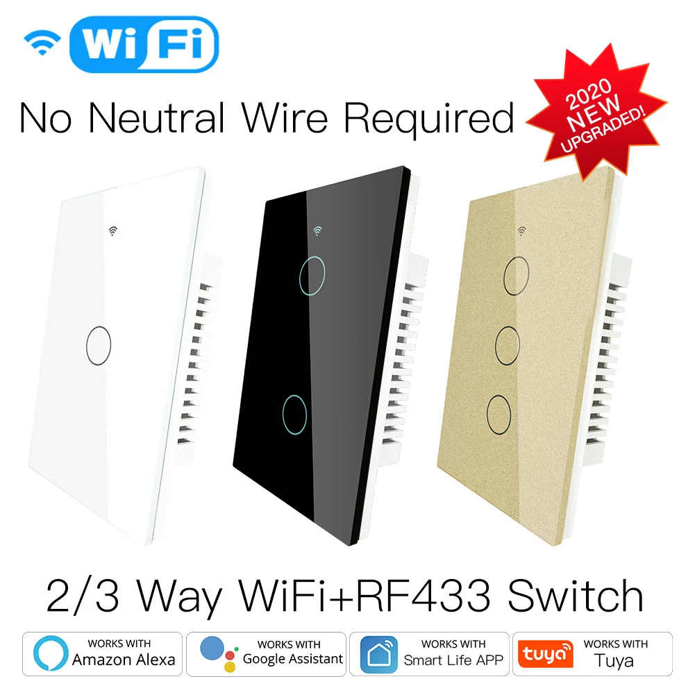 RF433 Wi-Fi настенный сенсорный Переключатель No нейтральный провод нужен Беспроводной приложение Smart Life/приложение Tuya реле статуса и Подсветка будет выключаться через пульт дистанционного управления Управление смарт с помощью одножильного провода настенный выключатель работает с Amazon Alexa Google Home 110V/220V-1 шт./2/3 Ганг черный/белый/золотой Изготовитель: Moes 2020 Новое поступление Улучшено с более персонализированными точками: