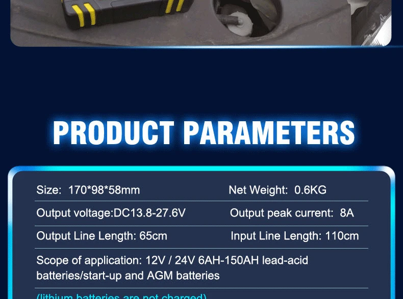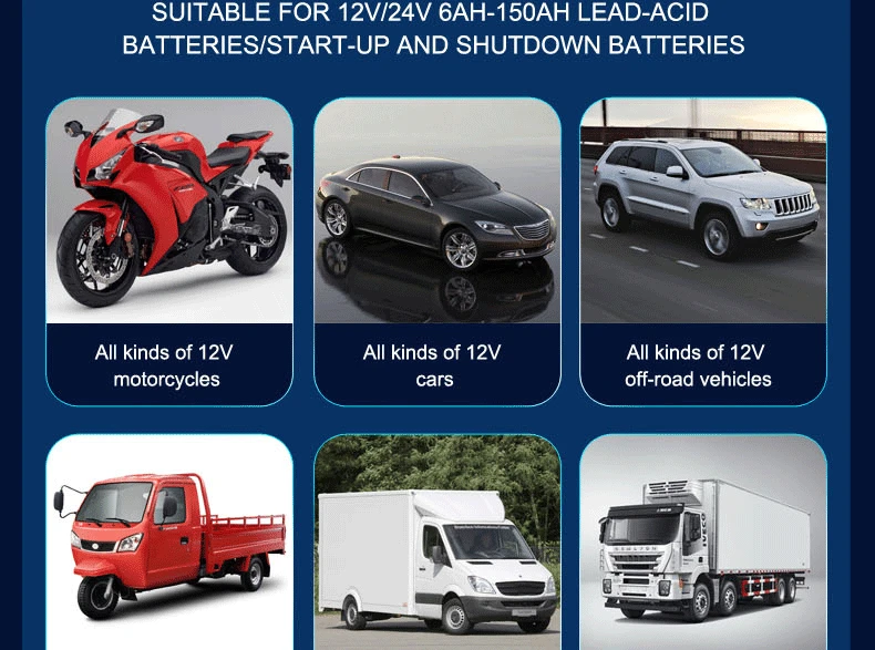 Посылка включает в себя:1 зарядное устройство для автомобильного аккумулятора1 х Руководство по зарядному устройствуТеплые советы:Большинство типов свинцово-кислотных батарей, включая кальций, гель и AGM, влажные, EFB и т. д. Адаптация: 12 В/24 В Универсальный (Примечание: литиевая батарея запрещена).Подключение батареи: красный зажим положительный аккумулятор (+), черный зажим (-)