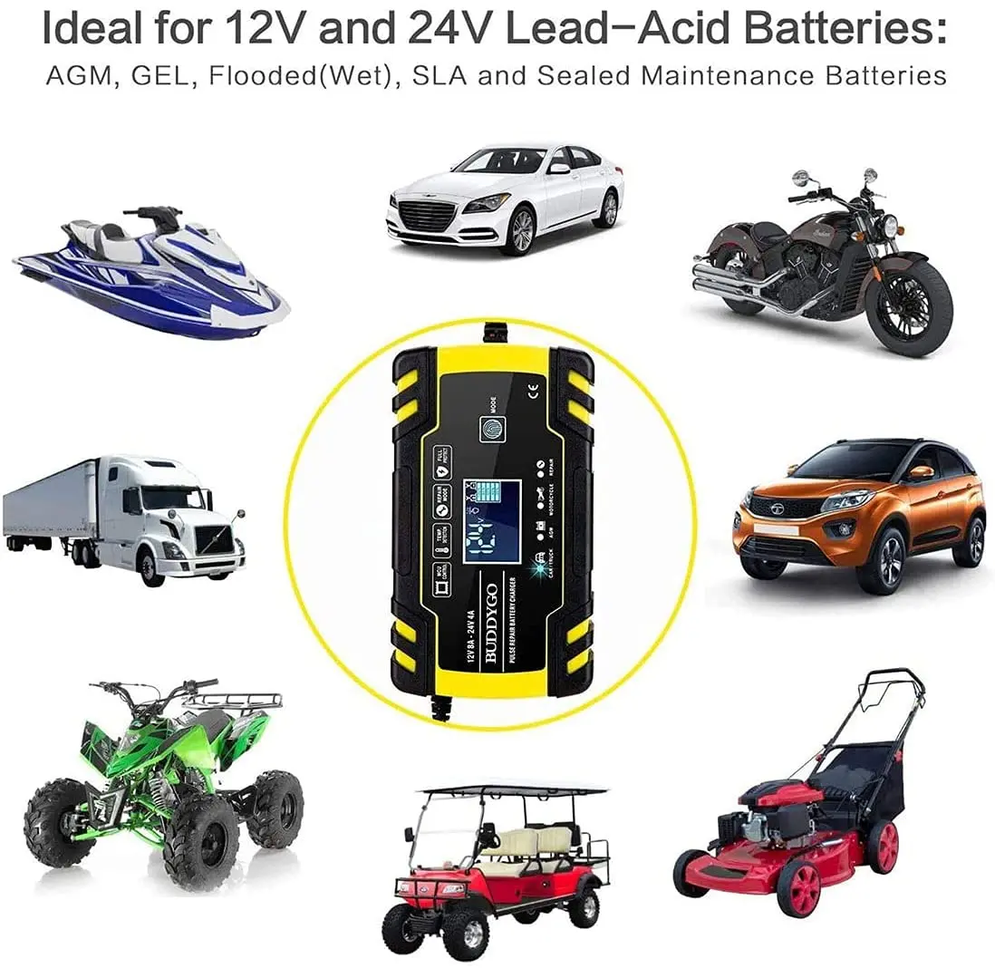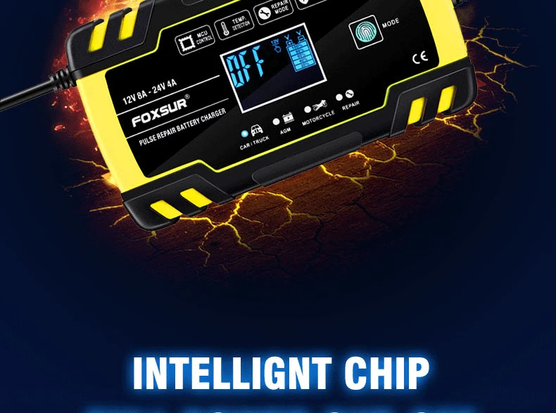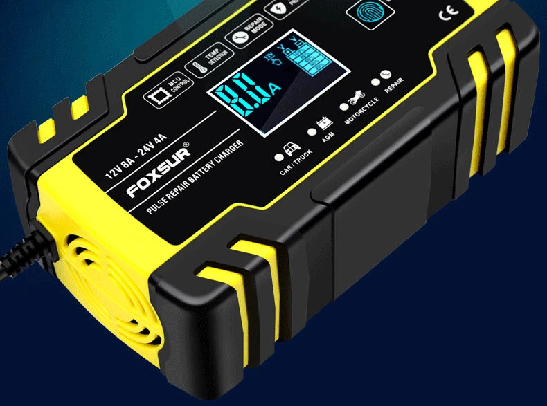 Buddygo или Foxsur 12V/24V 8AАвтомобильное зарядное устройство для аккумулятора с полностью автоматическим высокая частота зарядки обеспечивает с 3-я ступенями для зарядки, автоматическое переключение от быстрая зарядка, чтобы топ-отключение, то, чтобы при непрерывной зарядке малым током светодиодный индикатор заряда.-6 режимов работы1. Режим "автомобиль/грузовик"2. Режим "мотоциклиста"3. Режим agm'4. Режим "ремонтный"5. Режим "лето"6. Режим "зима"Особенности:-Широкое напряжение, автоматически регулирует зарядный токЭто зарядное устройство предназначено для батарей 12 В и 24 В, мощность 140 Вт, пиковый ток 8 А, быстрая зарядка.-Широкий спектр использованияМульти-режим нажатием одной кнопки переключения, 3-режимный батарея заряда, не повреждает батарея. Он может заряжать автомобиль, тележку для гольфа, мотоцикл, газонокосилку, лодку, RV, SUV, ATV и многое другое.-Множественная защитаЗащита от перезарядки, защита от перенапряжения, защита от перегрузки по току, защита от перегрева, защита от низкого напряжения и т. д.-Простота в эксплуатацииПодключите аккумулятор к источнику питания и выберите режим для автоматической зарядки. Он принимает прецизионное управление ЦП для полной самоостановки.ЖК-дисплей-Отображение напряжения и тока зарядки-Отображение температуры зарядки (внутренняя температура)-Режим зарядки дисплея (автоматически подходит для летнего или зимнего режима)-Отображение 'эро' (обратное соединение или выходное короткое замыкание.)-Светодиодный индикатор режима зарядки сенсорного экрана