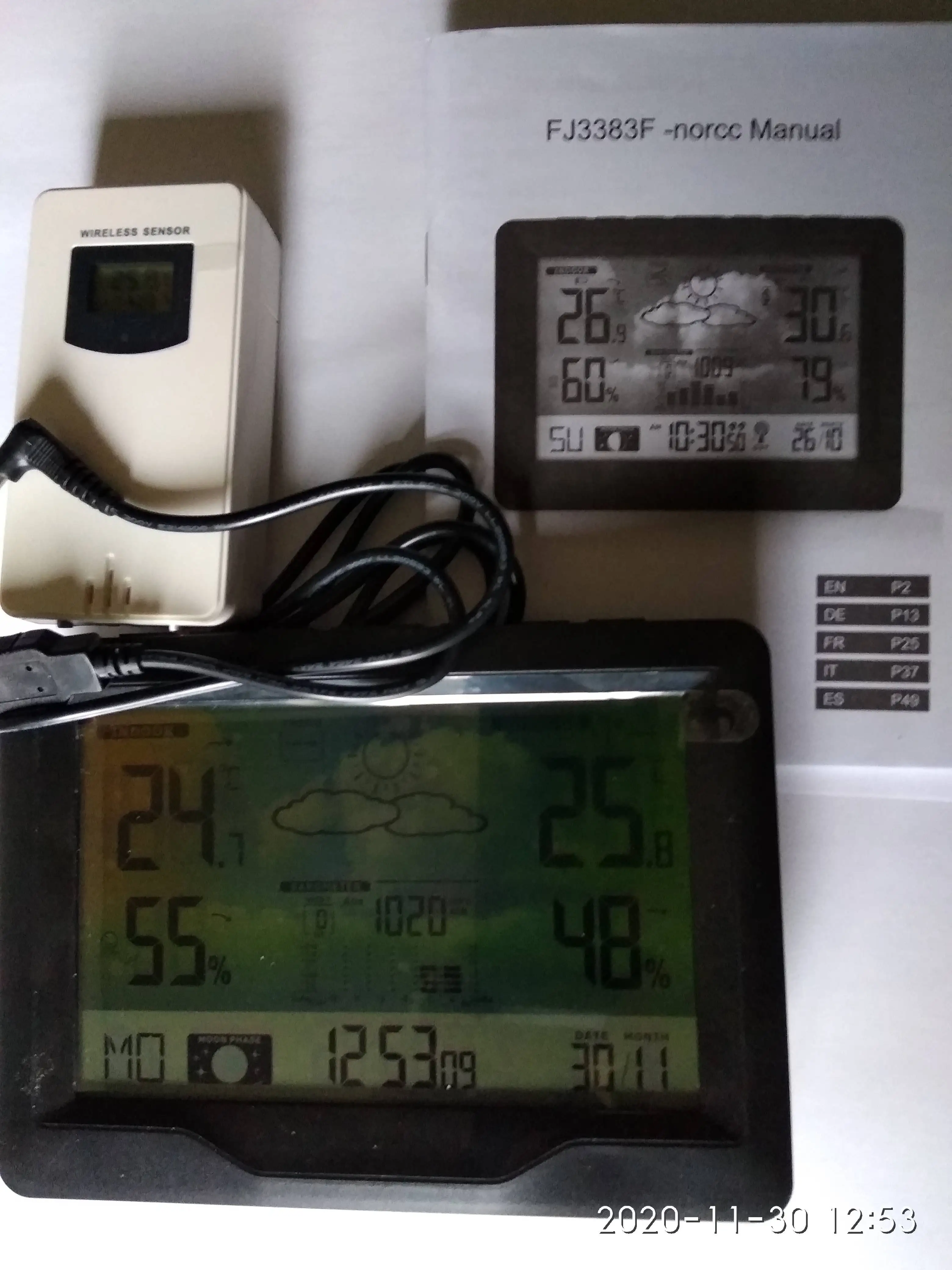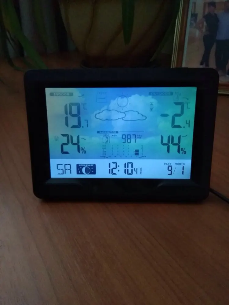 Провода на улицу от внешнего датчика нет в комрлекте, нужно крепить его самого. Это проблема. В комплекте нет блока питания, питается от usb. Не показывает в мм рт ст давление, так всё остальное ок.