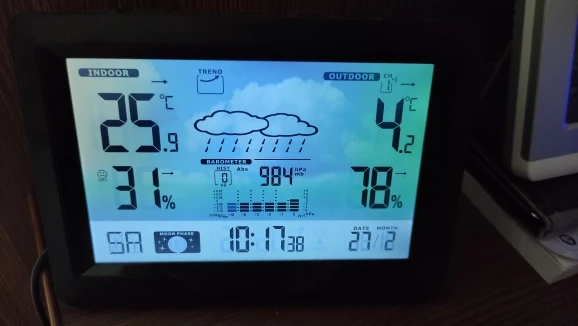Несколько советов для будущих покупателей: 1).Метеостанция идёт БЕЗ батареек, а их надо две АА в саму метеостанцию и две АА в выносной блок-датчик, и при отключении питания без батареек сбрасывается всё в ноль! (продавец мог бы и расщедрится на такой подарок); 2).Станция идёт только со шнуром USB, адаптера питания просто нет!; 3). Станция не русифицирована, как и инструкция по эксплуатации!; 4). Давление меряет в гектоПаскалях или дюймах(!) ртутного столба с погрешностью!; 5). Чересчур яркий ночью даже в приглушенном режиме; 6). Очень ограниченный угол обзора - стоит лишь чуть отойти, и уже не видно вообще ничего, кроме фона!; 7). Выносной блок-датчик сделан весьма неумно: возможности крепления его снаружи окна нет никакой, надо думать, куда его приделать, чтоб ловил сигнал, был виден внутри и не заливало дождем, не засыпало снегом! Всё!