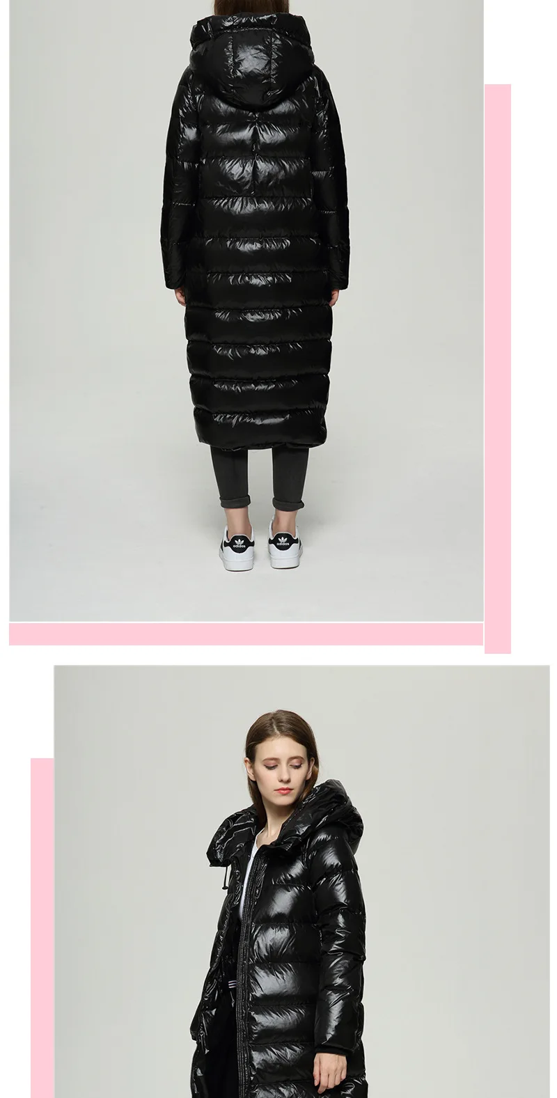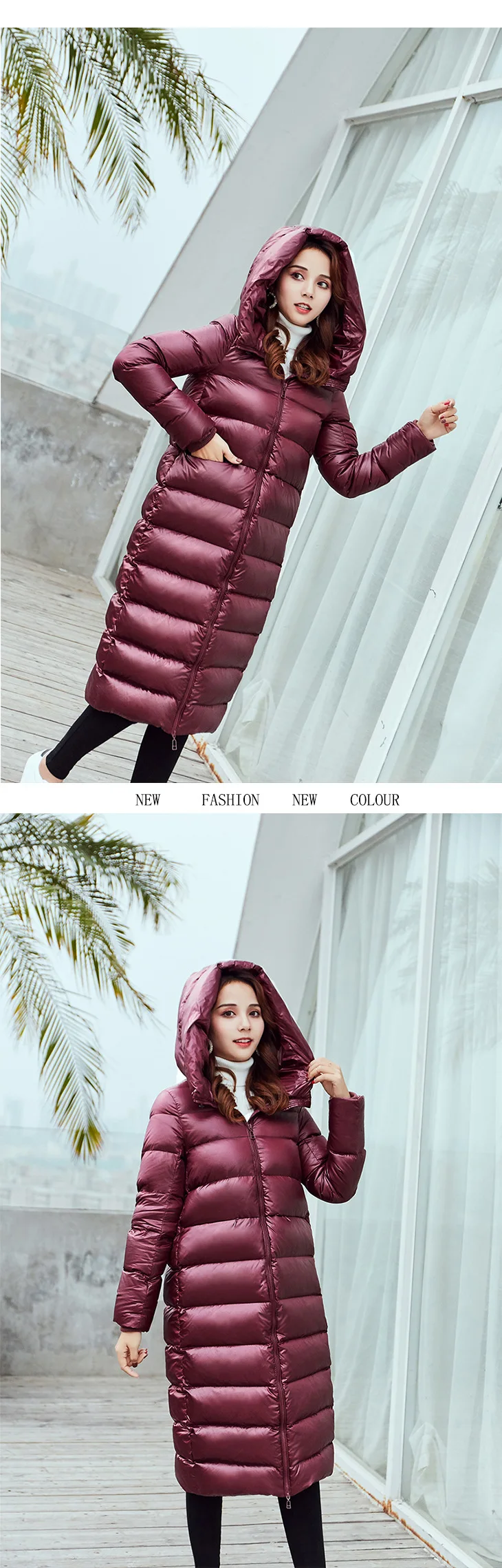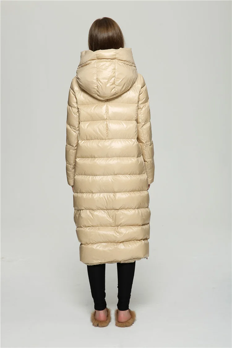 Женское пуховое пальто, длинное блестящее пальто выше колена с капюшоном, 2021 пуховик на белом утином пуху, куртка s, 90%
