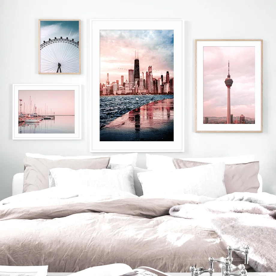Колесо обозрения Круизное Судно Городской Пейзаж Плакат Nordic Розовый Синий Картина на холсте с изображением неба настенные картины для Гостиная домашний декор
