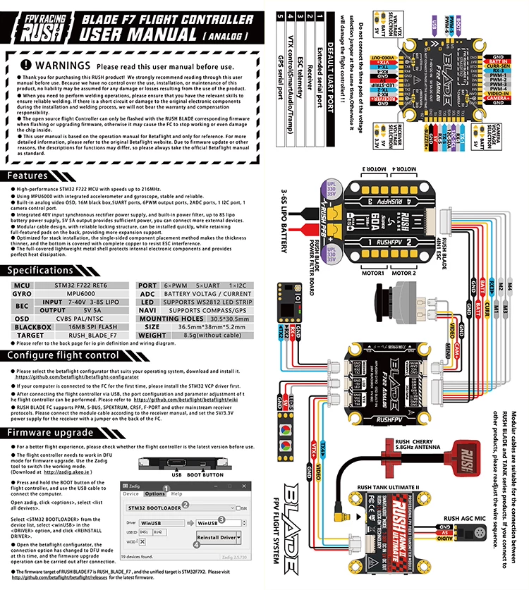 RUSHFPV RUSH BLADE F722 аналоговый 50A Sport 3-6S BLHELI32 4 в 1 Бе...
