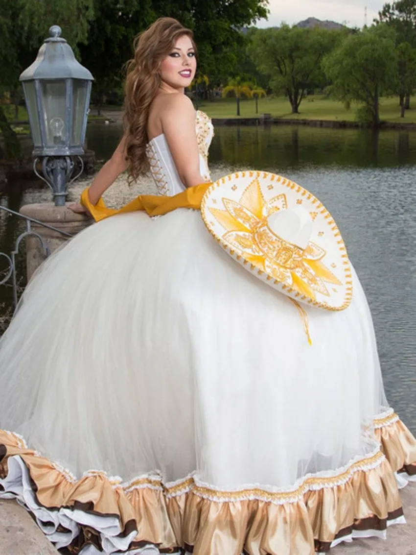 Женское бальное платье, Белое Бальное Платье с жакетом и золотой вы...