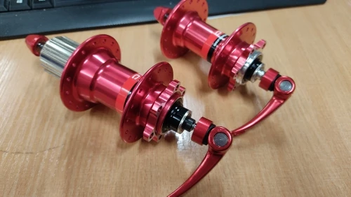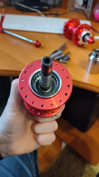 Не получилось через фото передать цвет. Он красный, но с розовым оттенком. В описании товара это указано. На передней втулке подшипники немного подклинивают. Задняя отличная. Смазка в подшипниках прозрачная, похожа на вазелин технический. Собачки не смазаны (я смазал маслом для цепи). В целом мне понравилось качество изготовления. Я рекомендую к покупке. А подшипники или смазку в них можно и заменить при желании.