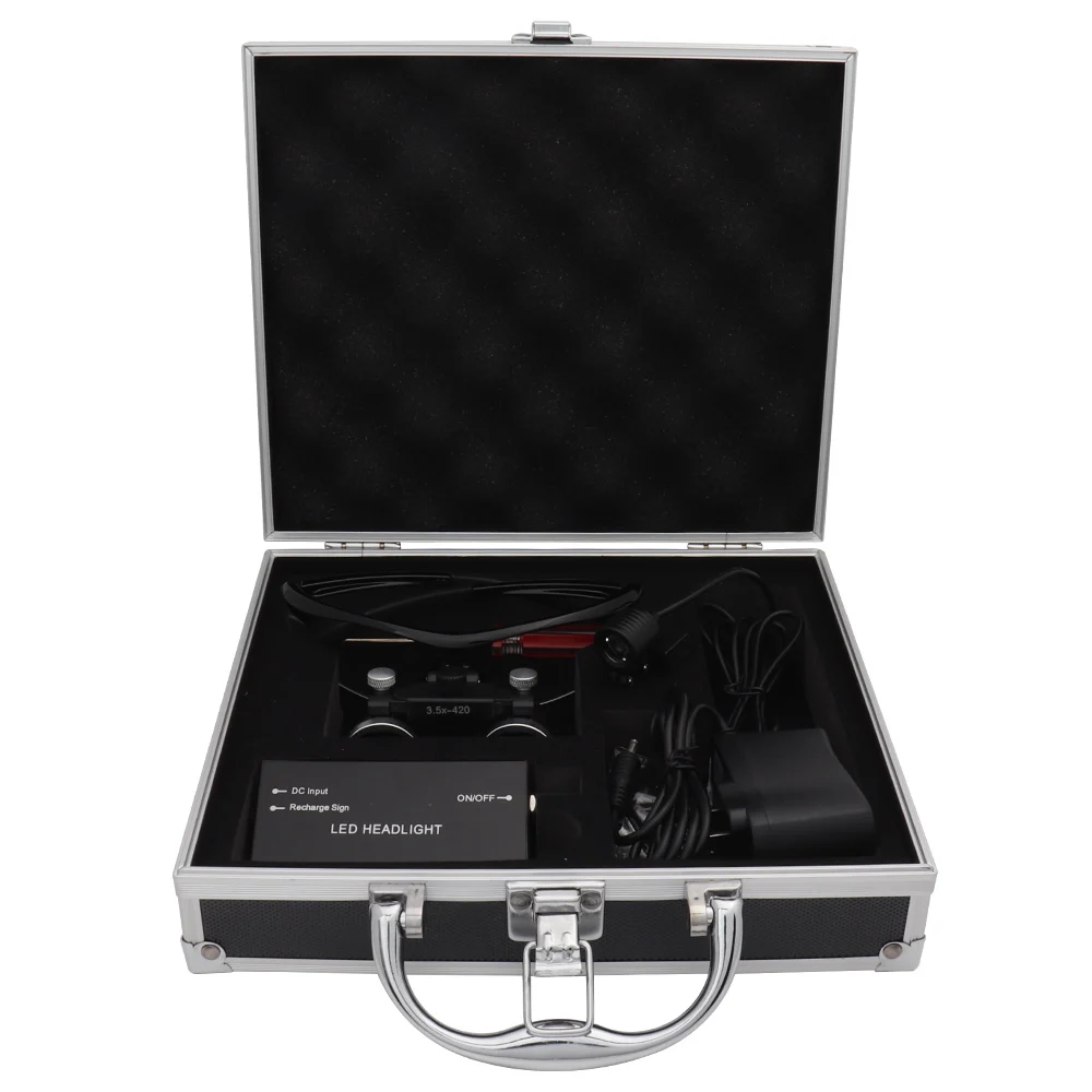 "Спецификация: Увеличение: 3,5x Рабочее расстояние: 420 мм Глубина резкости: 80 мм Поле зрения: 60 мм Оправы: никелевый сплав или титан Особенности: Светодиодная лампа: 3 Вт Время непрерывной работы: после полной зарядки 5 ч Срок службы лампы: 10000 ч Аккумулятор: перезаряжаемый литий-ионный аккумулятор Яркость: регулируемая Входное напряжение: AC100-240V / 50-60 Гц "