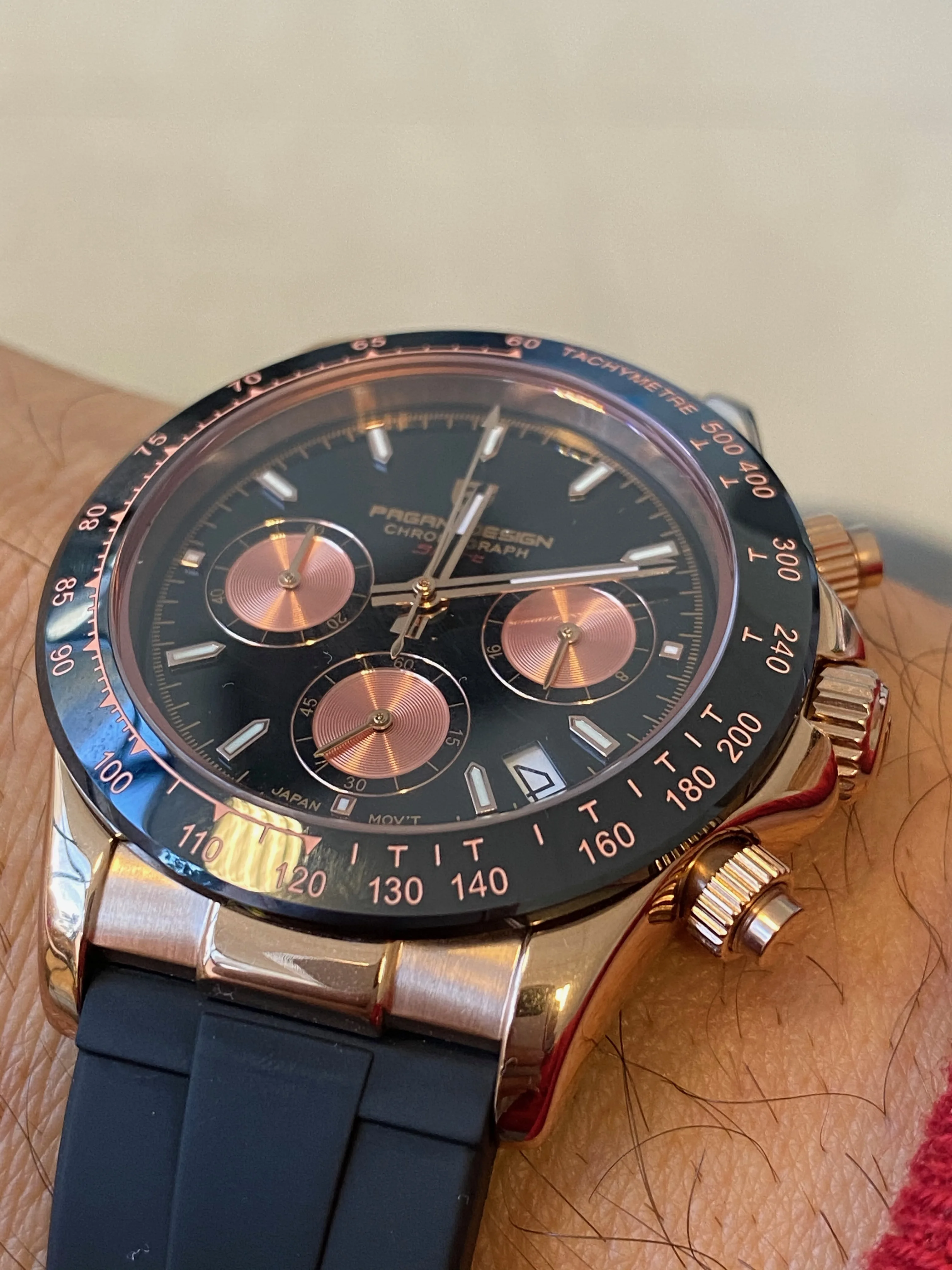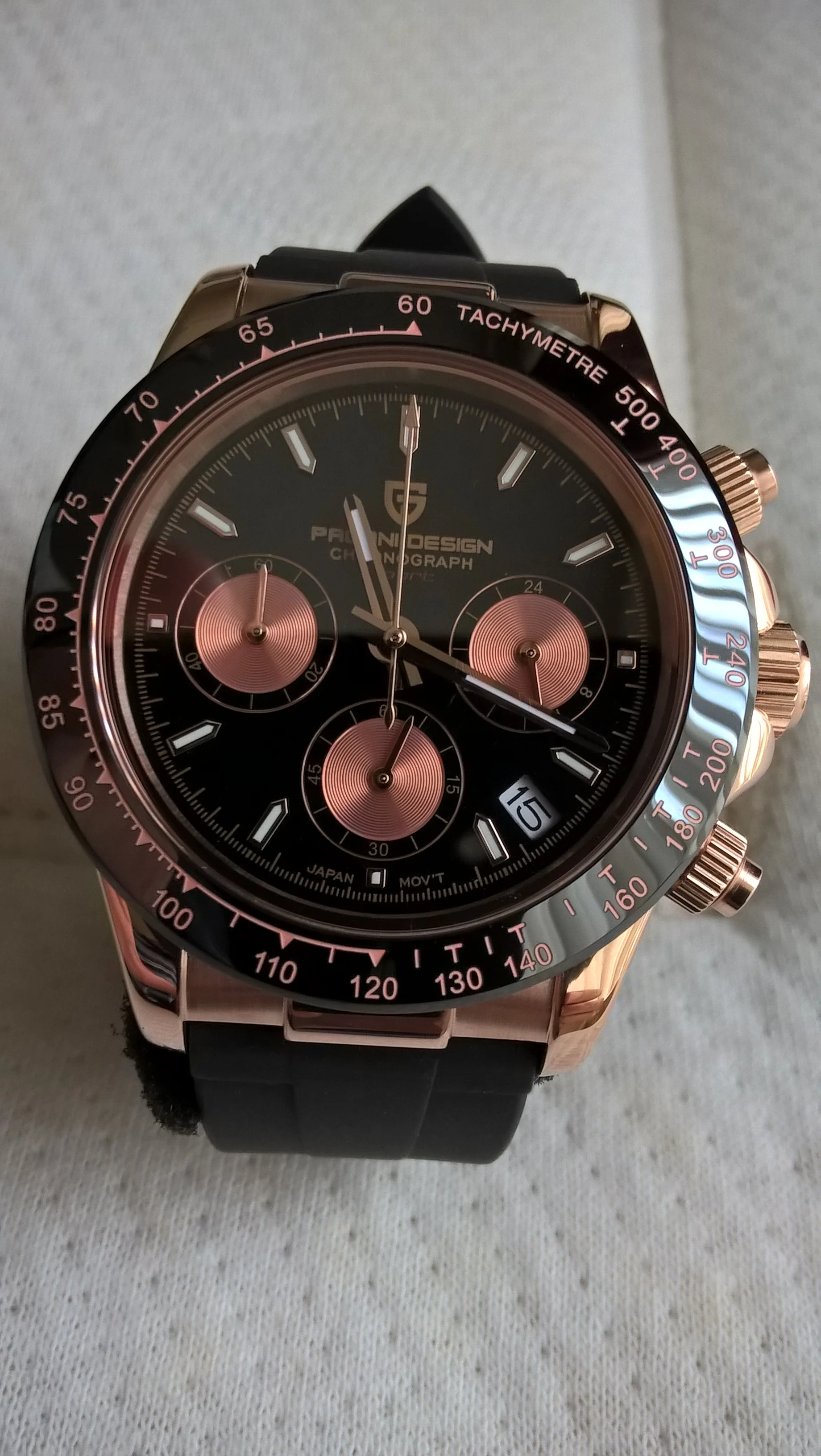 Эти дизайнерские часы Pagani имеют фантастическую ценность. Чехол из розового золота не подходит к циферблатам из розового золота, но все равно выглядит хорошо. Очень удобный резиновый ремешок. Чрезвычайно медленная доставка была единственным разочарованием с этим заказом, заняла около 8 недель, чтобы достичь NZ.