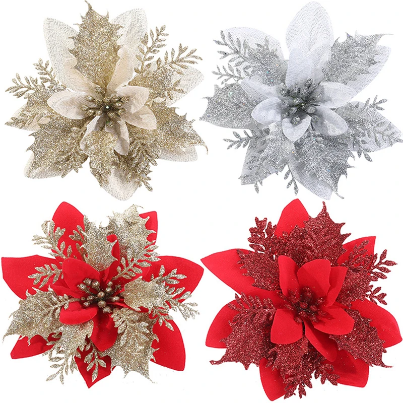 Искусственные Рождественские цветы, блестящие искусственные цветы, ...