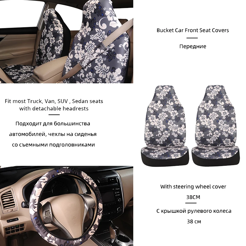 Название продукта: ковш автомобильное сиденье протектор Материал: полиэфирное волокно + цифровая печать Расположение транспортного средства: спереди Цвет: Синий чехол на сиденье + белый цветочный узор Количество: 2 чехла на сиденья, 1 чехол на руль Вес посылка: 500 г