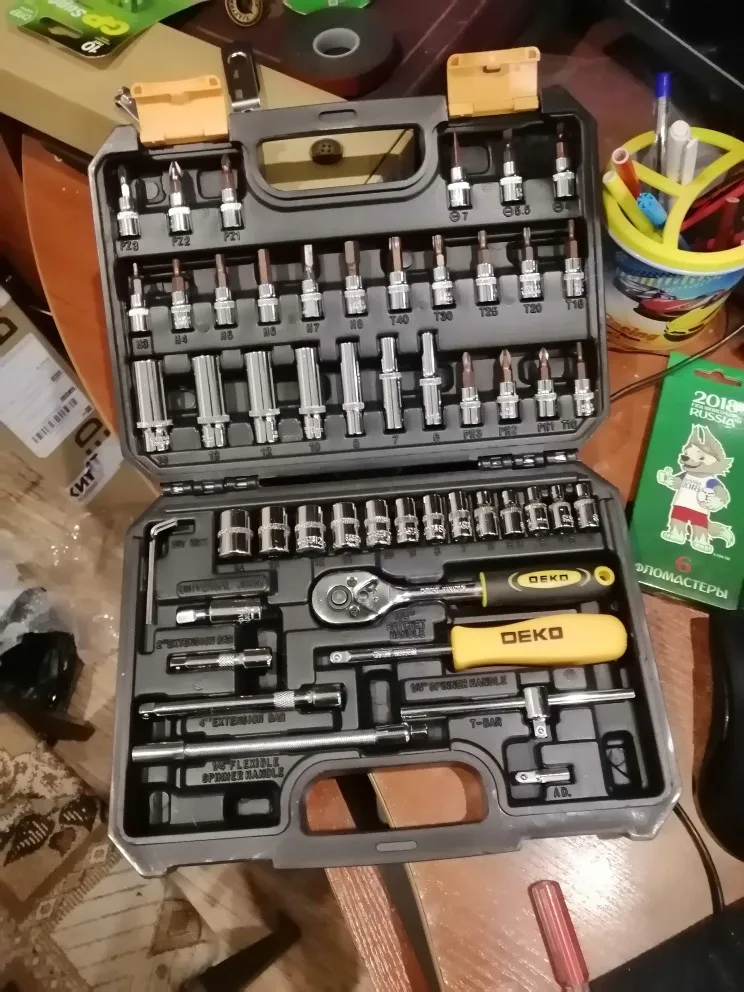 Продавец долго отправлял посылку А так посылка после отправления, быстро дошла до меня Набор нормальный, в деле ещё не применял, не хватает тут головок на 17 и 19. Если они вам нужны, зайдите в леруа, там продаются Купил на распродаже за 900 руб