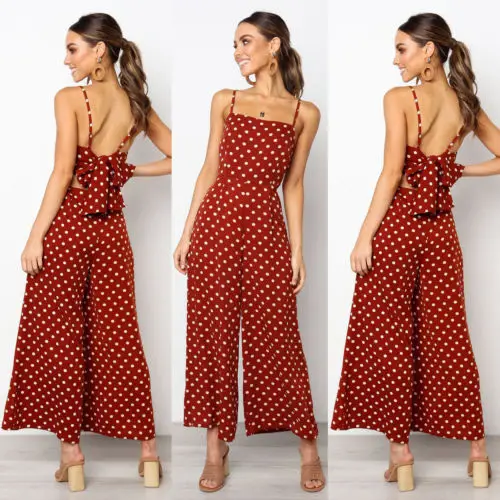 Комбинезон женский без рукавов, элегантный пикантный свободный Ромпер в горошек, брюки с широкими штанинами, праздничный комбинезон со шнуровкой с открытой спиной и бантом