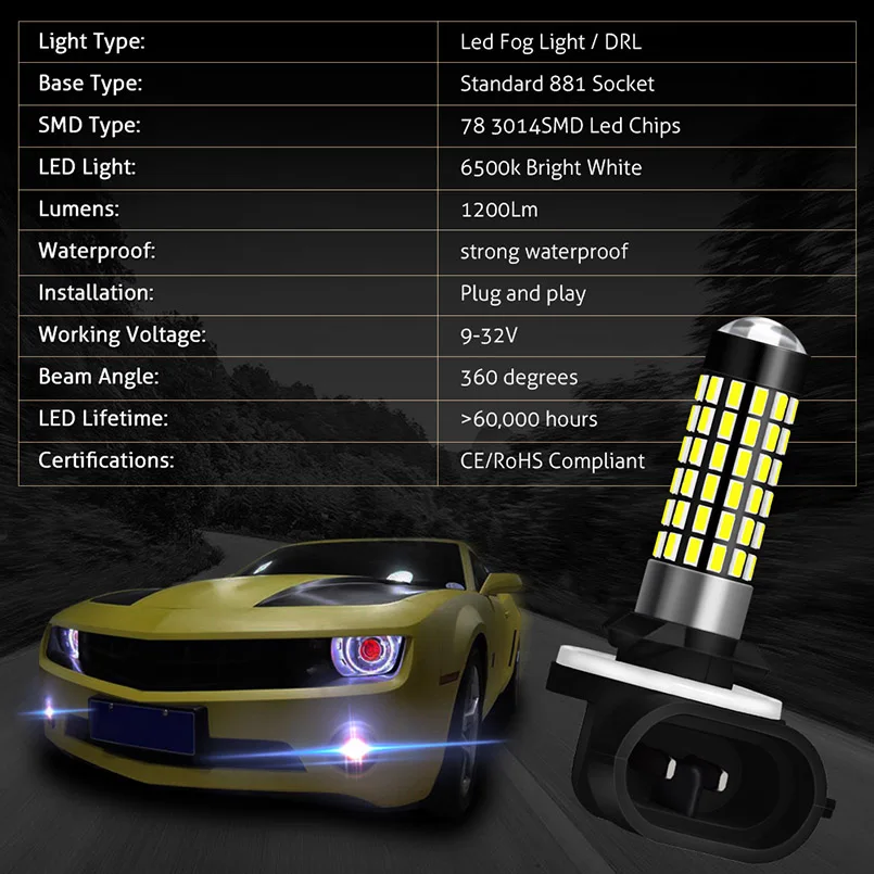 Тип основания: Стандартный H27 881/880/H1/H3/H11 Тип светодиодный: 3014 чип (78 светодиодный s количество) Светодиодный Цвет: белый Водонепроницаемость: IP68 Рабочее напряжение: 12В-24В Материал: алюминий Люмены: 1200 люменов Цветовая температура: 6000K Угол луча: 360 градусов Светодиодный срок службы: 60 000 часов Тип: светодиодный светильник для замены Совместимый список: 881 H27W/2 Применение: общее использование для сигнала поворота, тормоза, парковки, хвоста, DRL и противотуманных фар на автомобиле, грузовике, внедорожнике, фургоне, мотоцикле, скутере, прицепе, лодке, морском, И т. Д.