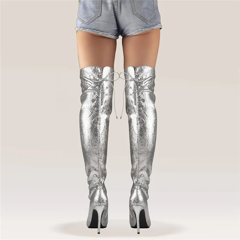 Onlymakerженские Серебристые ботфорты с острым носком; Модные блестящие высокие сапоги на тонком высоком каблуке с боковой молнией