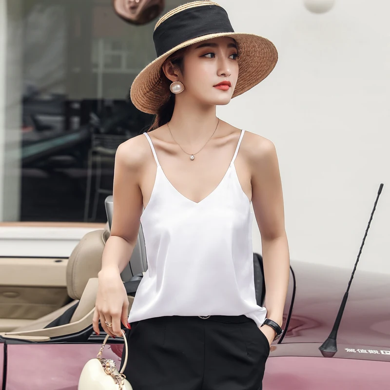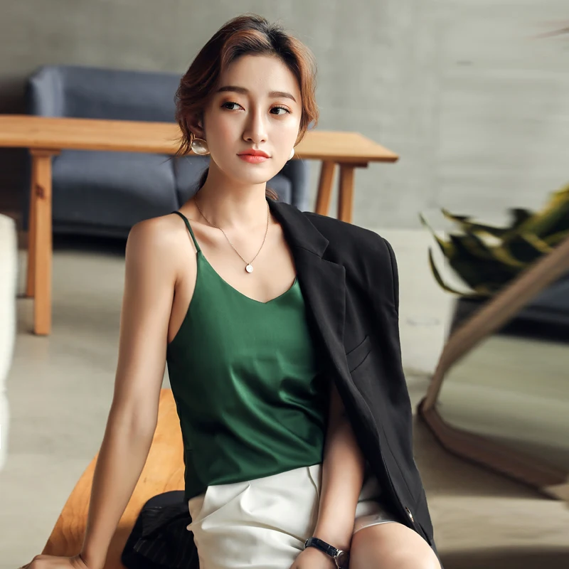 Майка женская атласная с V-образным вырезом, Шелковый однотонный топ в Корейском стиле для офиса, элегантная пикантная уличная одежда, клубный винтажный Топ
