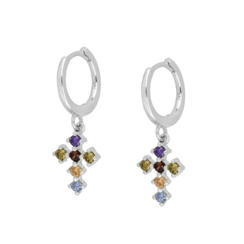 Серьги-кольца женские из серебра 925 пробы с подвеской в виде Креста из радужногофиолетовогобелого циркония