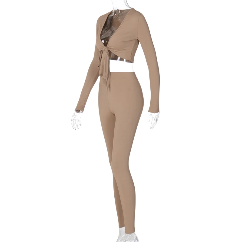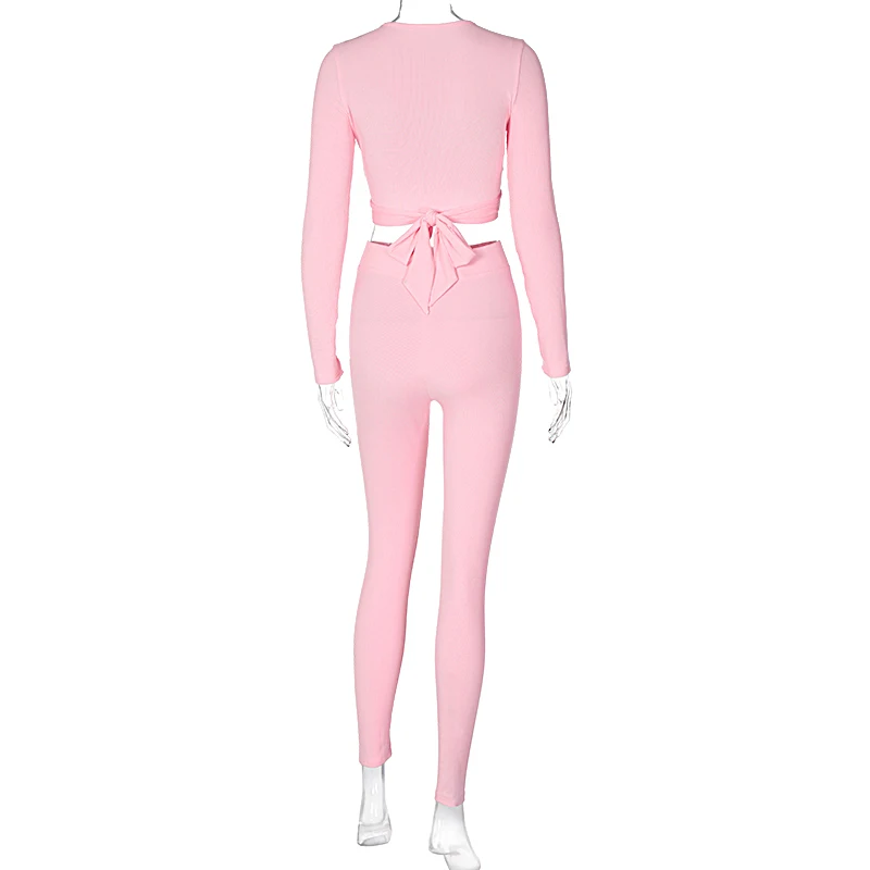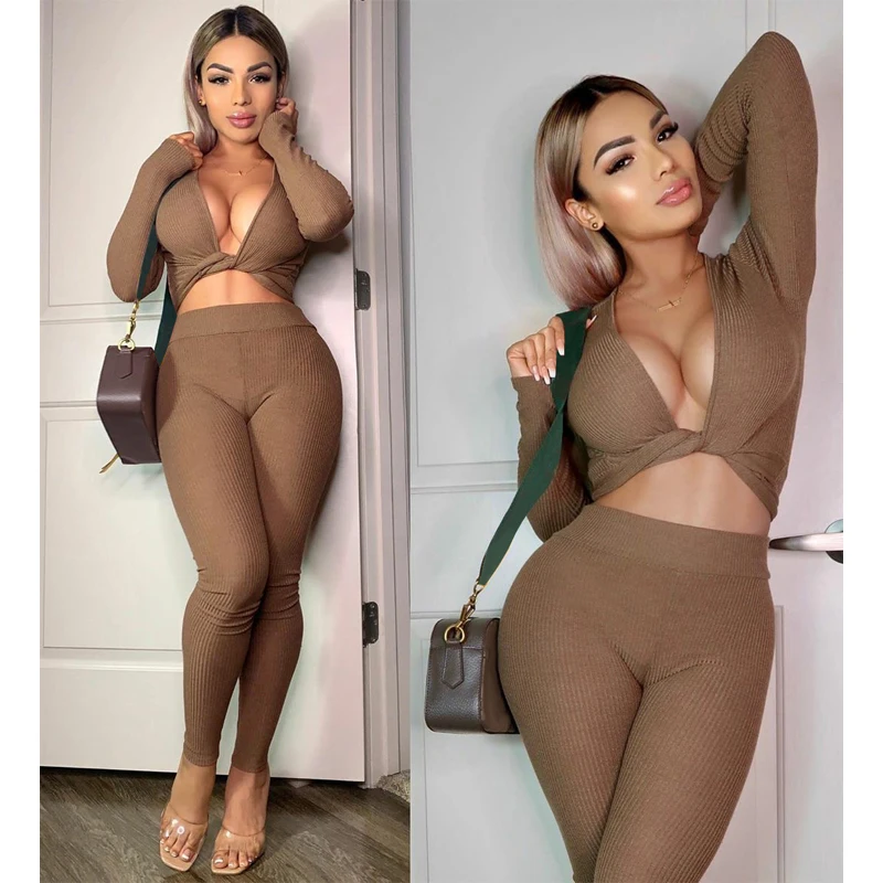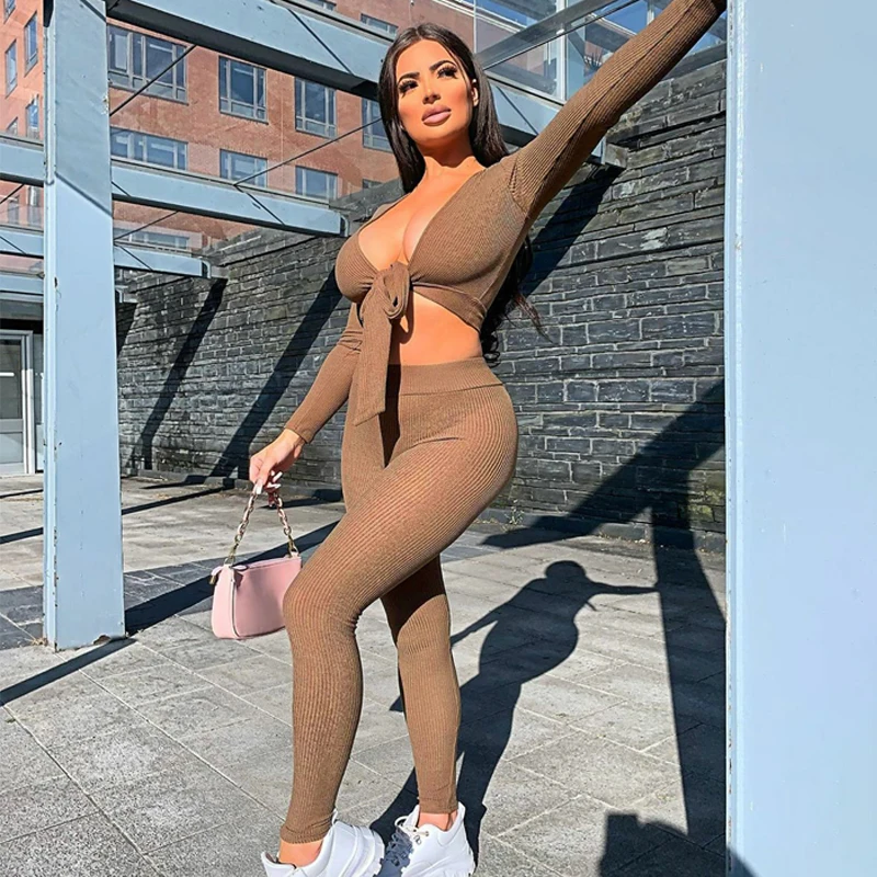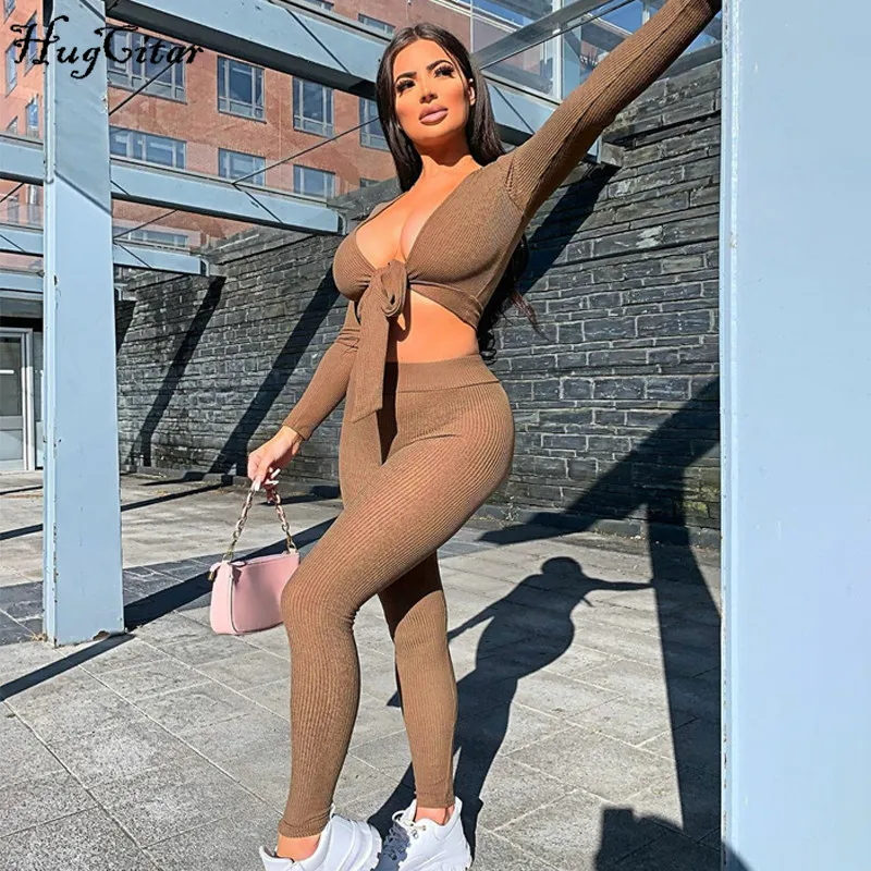Hugcitar 2020 с длинным рукавом обернутый бандажный укороченный топ леггинсы комплект из 2 предметов осень зима Женская мода уличная Strethcy Tracksui