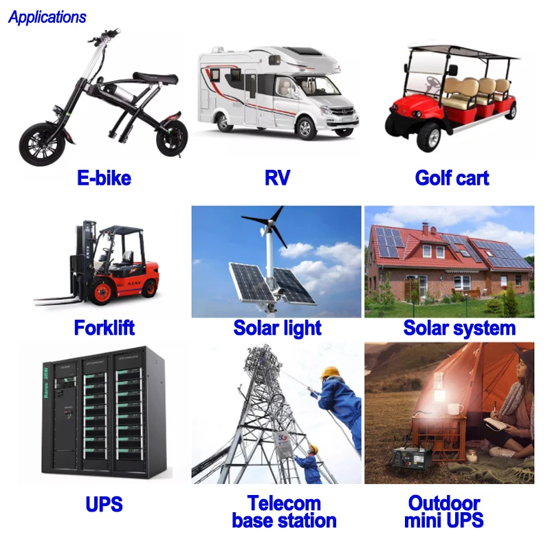 Электромобиль, электрический велосипед, трехколесный велосипед, скутер, тележка для гольфа, тележка, инвалидная коляска, медицинский инструмент, солнечная система питания, солнечная панель, хранилище энергии, электрические инструменты, электроинструменты, инструменты, светодиодный осветительный прибор, радиоуправляемые игрушки, инвертор, бытовая техника и область устройства, и т. Д.