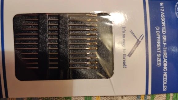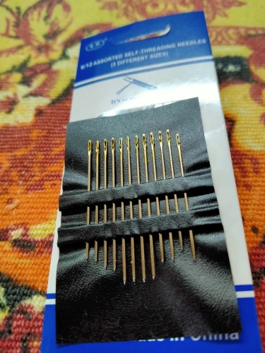 12 иголок с золотистыми ушками, чтобы отличать от старых обычных иголок. Иглы имеют размер 3, 3,5, 4 см. по 4 шт. Нитка удобно цепляется за вырез в ушке. Шить нормально. Хороший товар. Покупкой доволен.