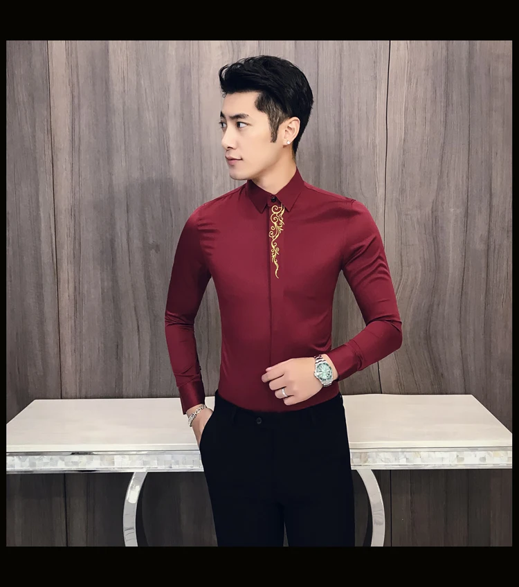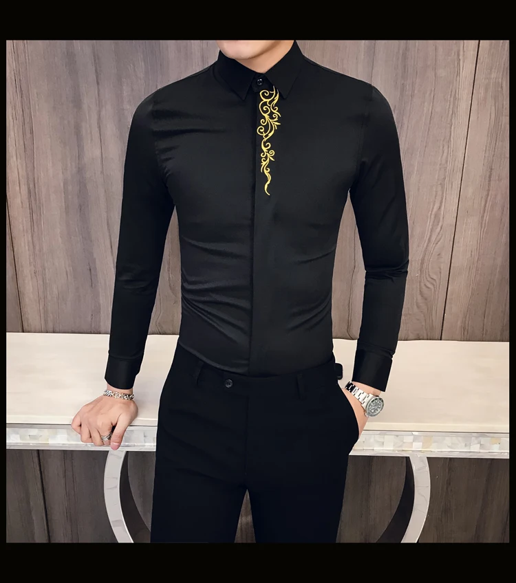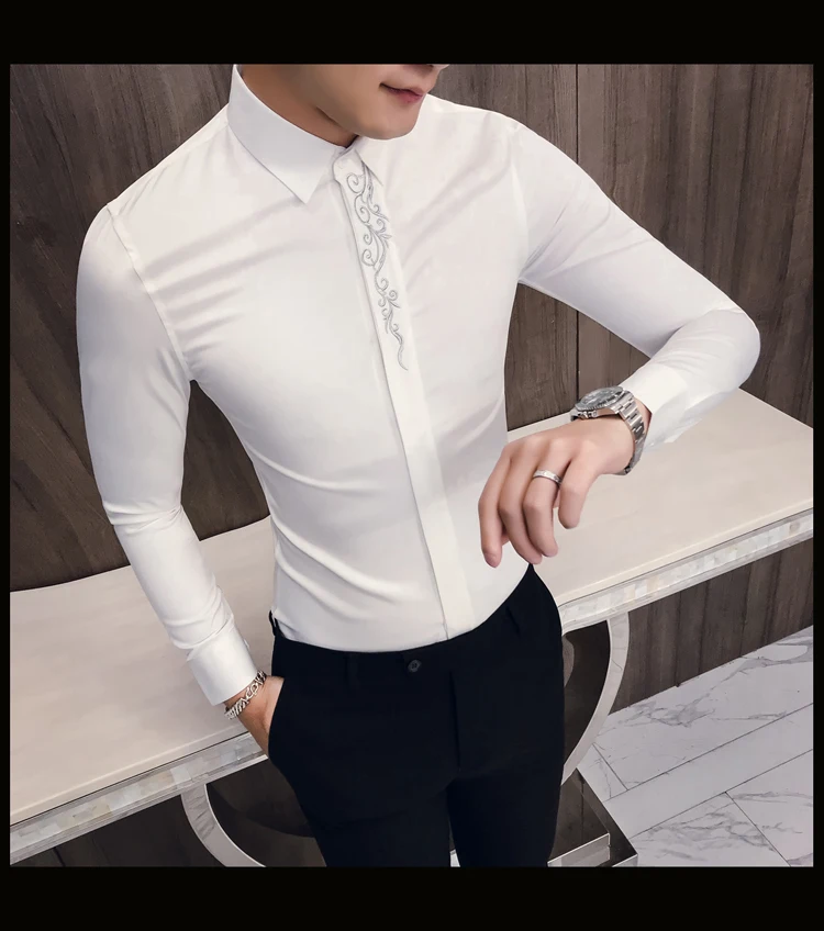 Мужская деловая рубашка с вышивкой, повседневная приталенная рубашка с длинными рукавами, деловая Клубная Классическая рубашка, осень 2020