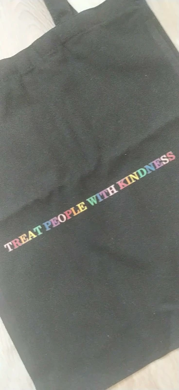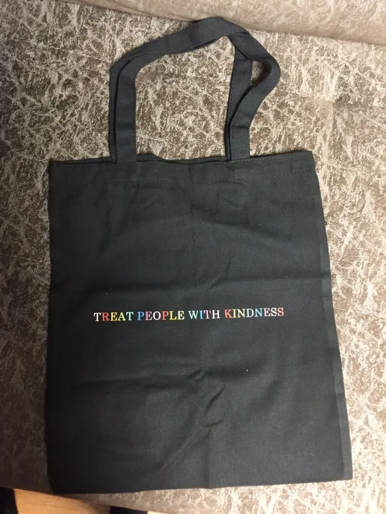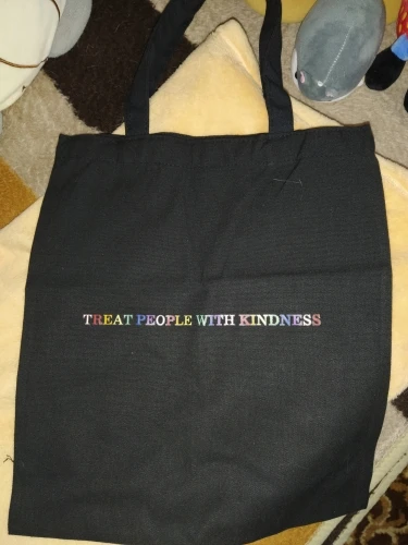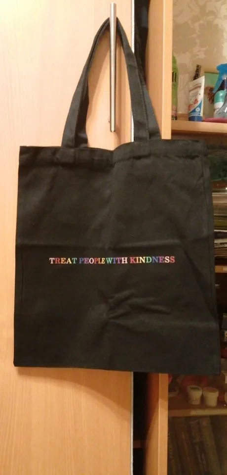 Шопер чудесный за свою цену. Дошел в Украину за пару-тройку недель. Плотная ткань, видимые швы очень аккуратные. Печать текста неплохая, по контуру видно следы клея, но не смотря на темную ткань светлые цвета остаются насыщенными. Единственное, хотелось бы немного длиннее ручки, мне не хватает 3-5 см. С продавцом не общалась.