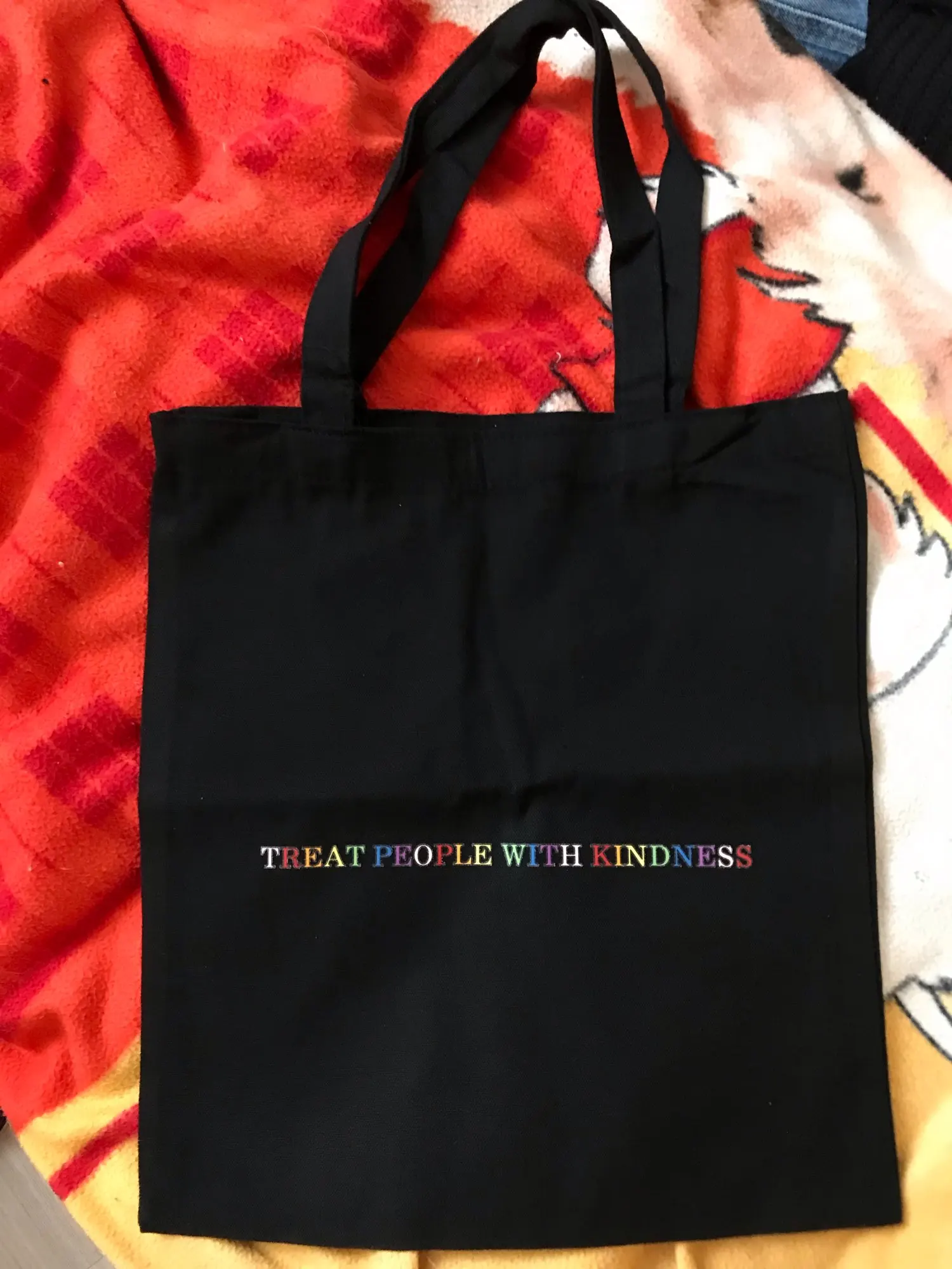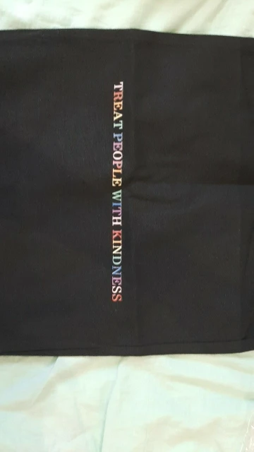 Плюсы: материал толстый и плотный, текст хорошо пропечатан, размер в характеристиках соответствует действительности, швы ровные. Минусы: есть пара торчащих ниток, но они практически незаметны