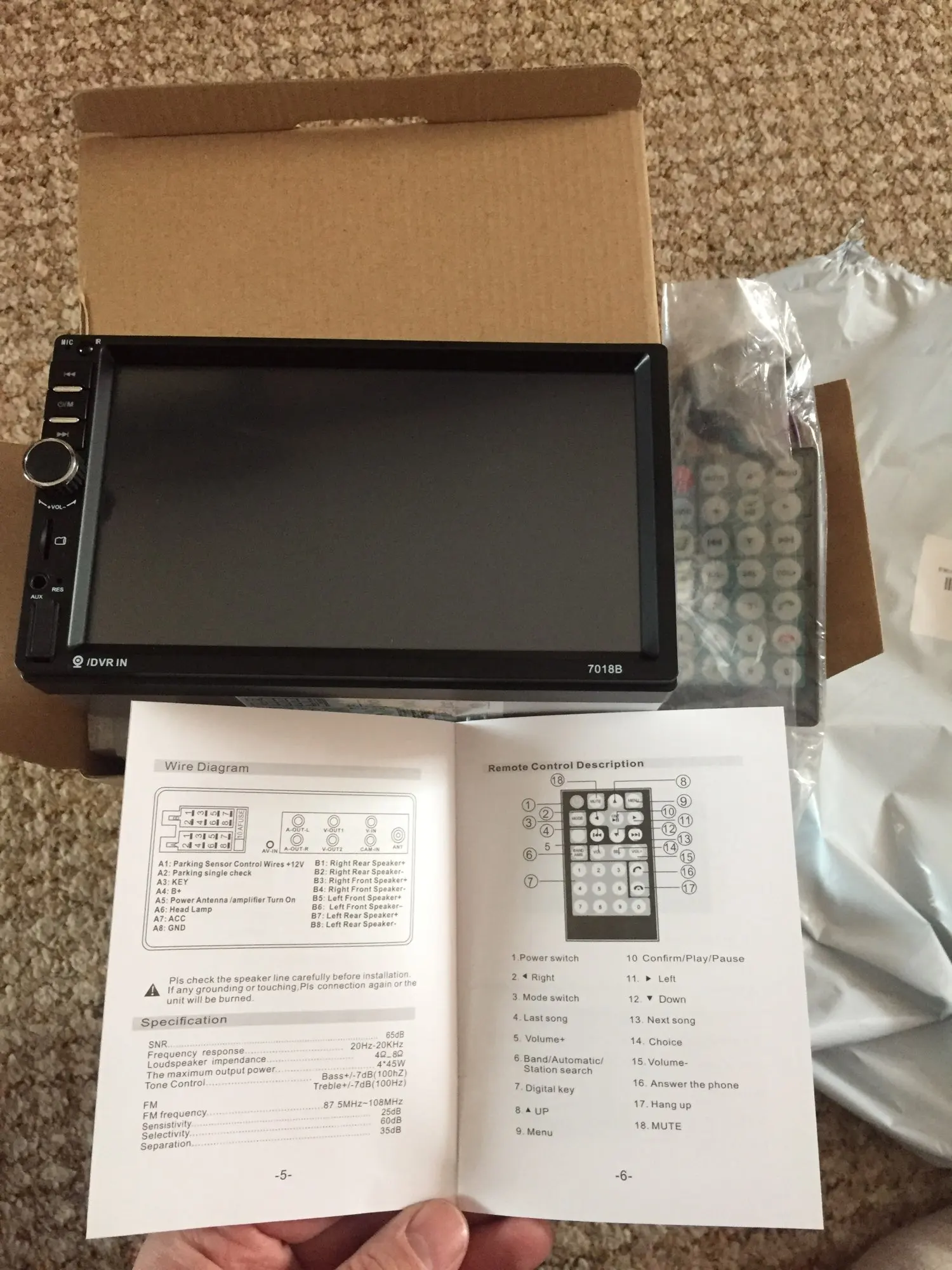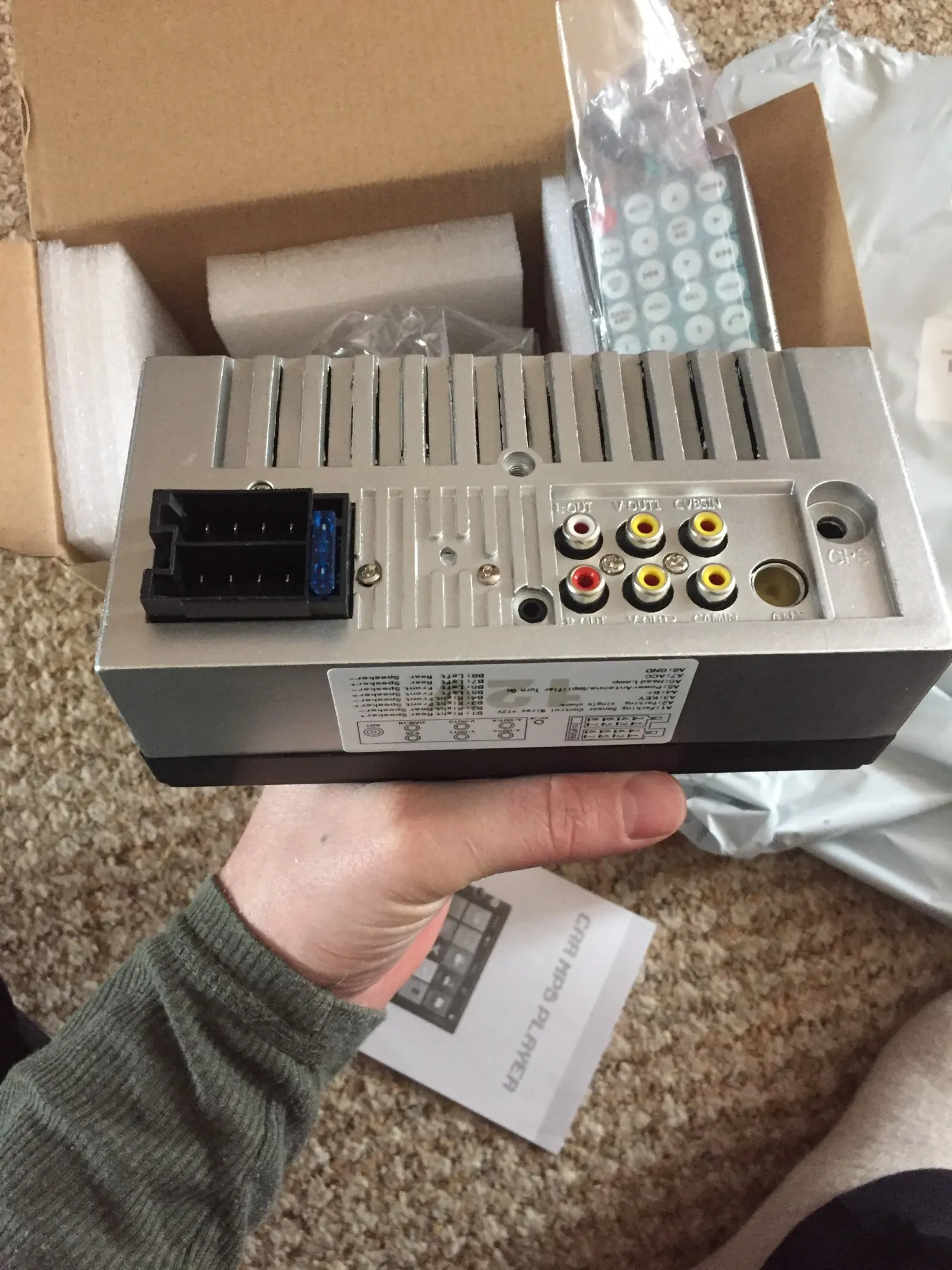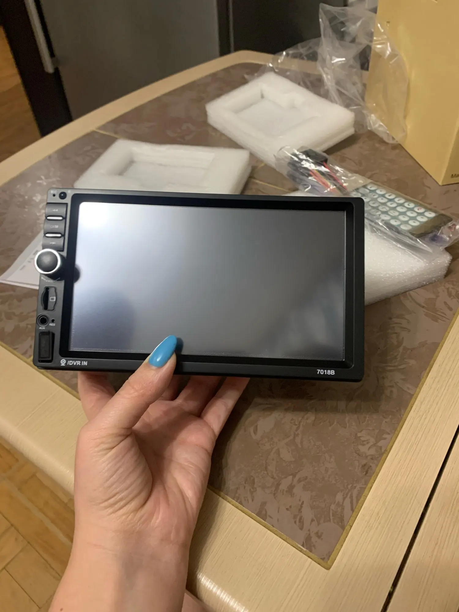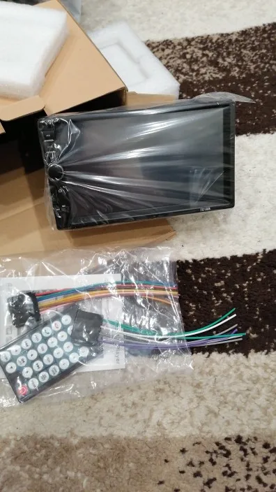 Пришла быстро. Коробка мятая, пока не включал. Ни проводов, ни пульта в комплекте нету, только магнитола