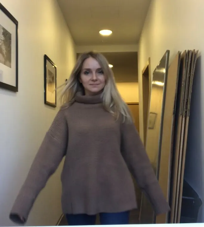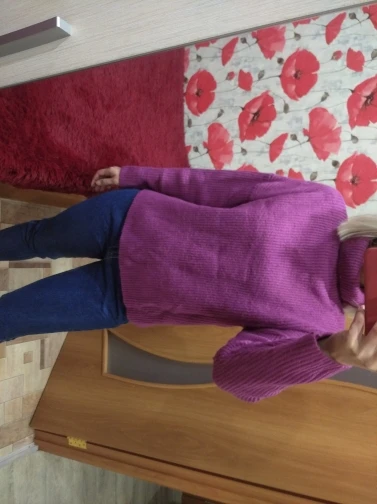 Очень быстрая доставка! Думала свитер будет чуть длиннее. Но, смотрится все равно хорошо.