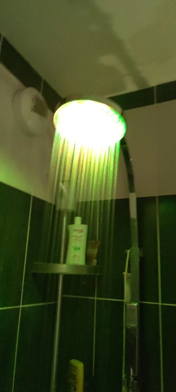 Эта насадка не реагирует на температуру воды. Раньше заказывал подобные, в них цвет изменялся, а эта просто мигает всеми цветами враз. Зато их много: красный, желтый, зеленый, синий. Прямо как НЛО))