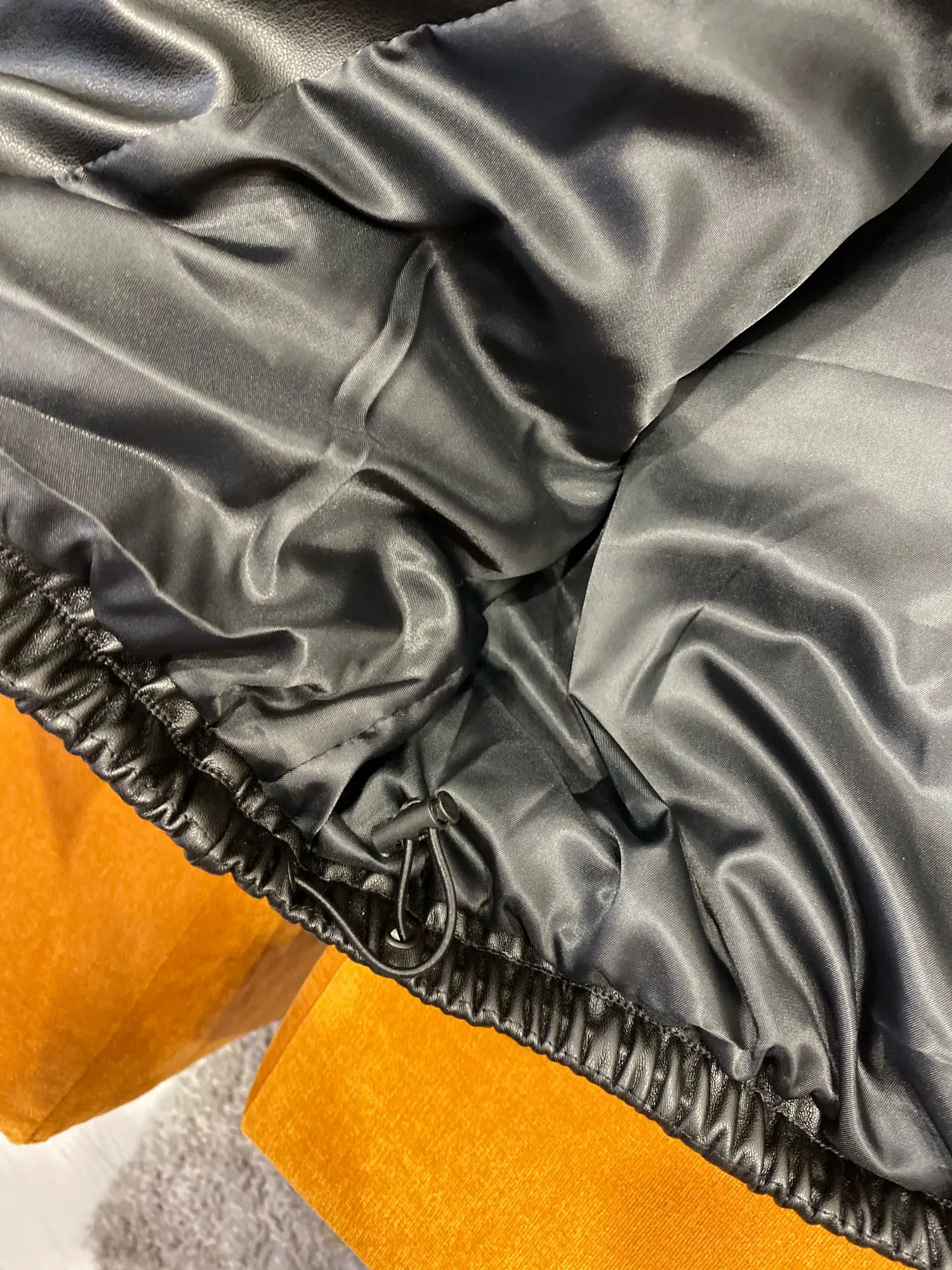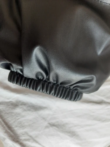 Качество кожзаменителя отличное! На рост 170, вес 50, взяла размер М, села хорошо. Спасибо продавцу, я довольна!