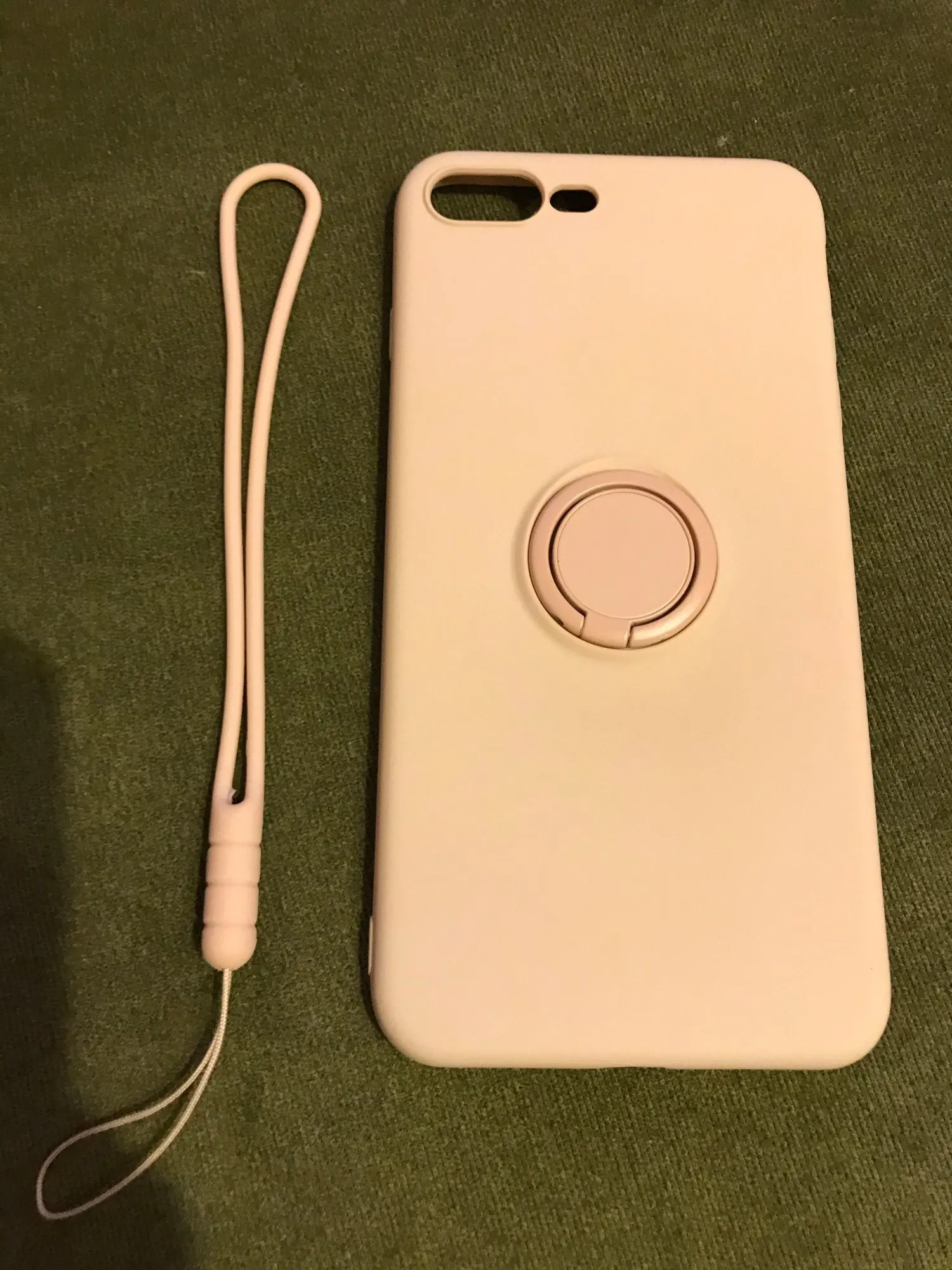 Цвет не белый, скорее светло-серый. В комплекте силиконовая петелька, чтобы держать в руке. Кольцо крутится, держится плотно. Внутри чехол обклеен бархатистой тканью. Очень приятный, выглядит достойно. Пришло примерно за 3-4 недели, с продавцом не общалась.