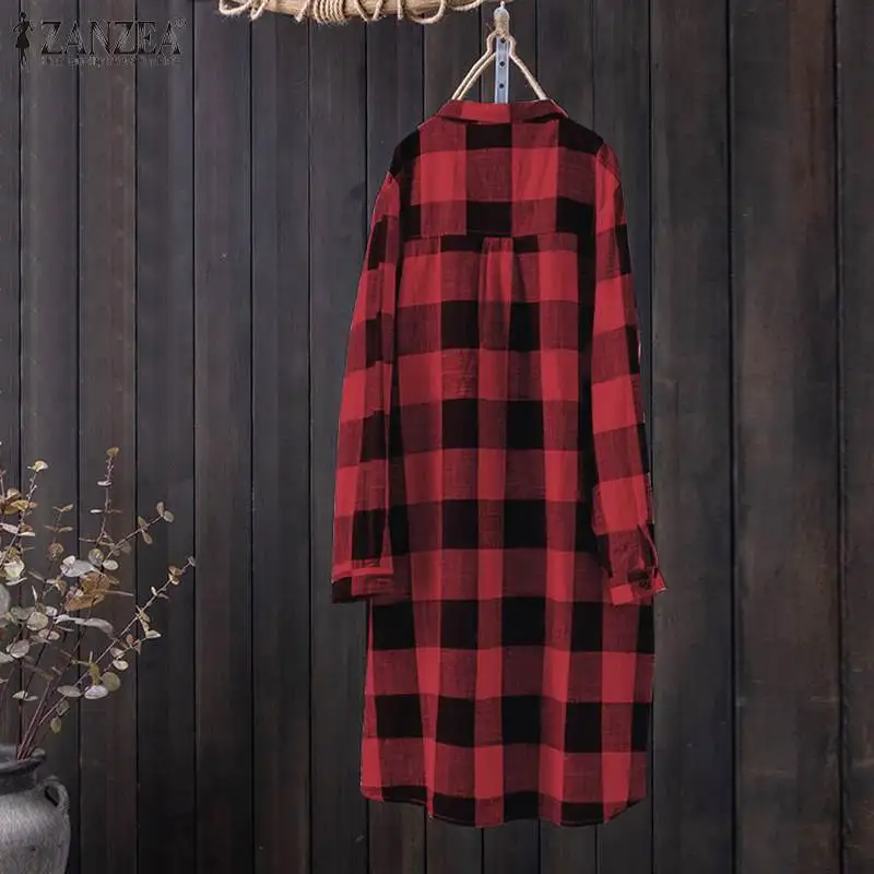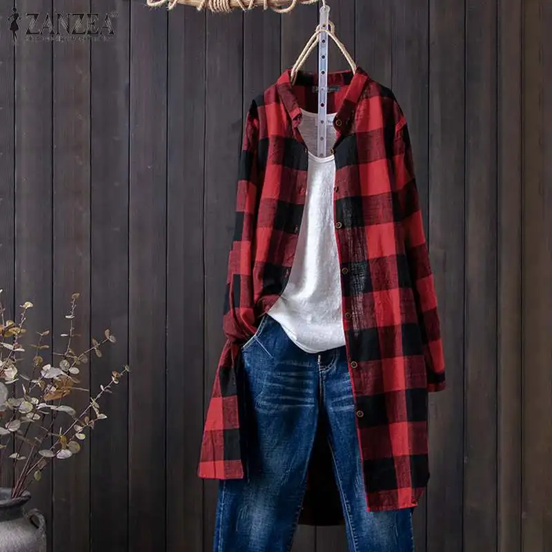 ZANZEA Осенняя винтажная клетчатая блузка с длинным рукавом, женские рубашки, Женская туника, топ, халат, сорочка, повседневные свободные длинные топы