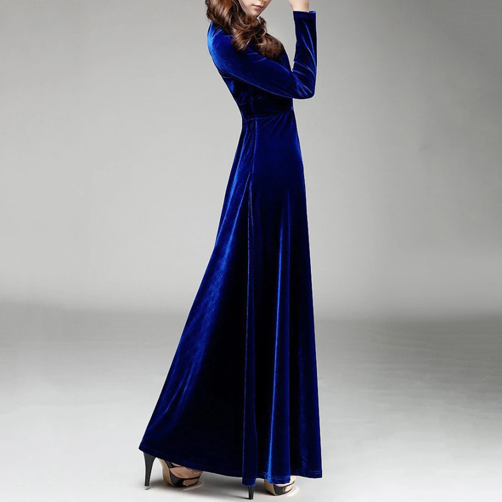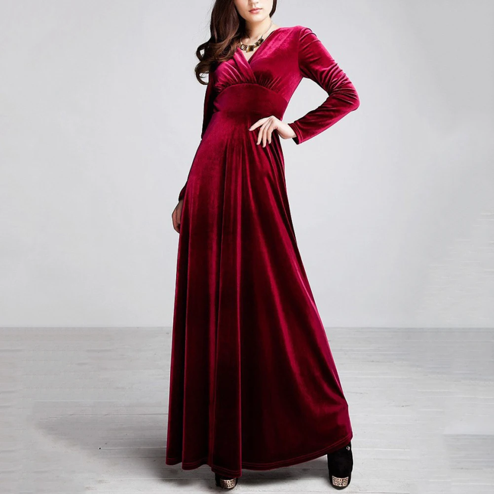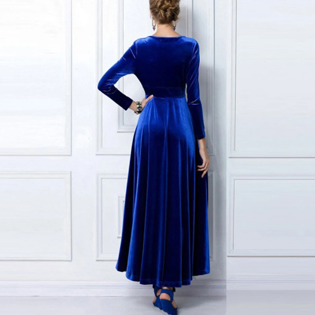 Женское бархатное платье макси, винтажное Плиссированное празднивечерние платье с длинным рукавом и V-образным вырезом, осень
