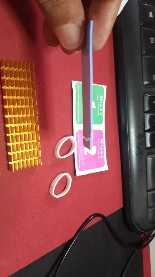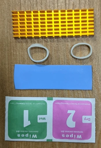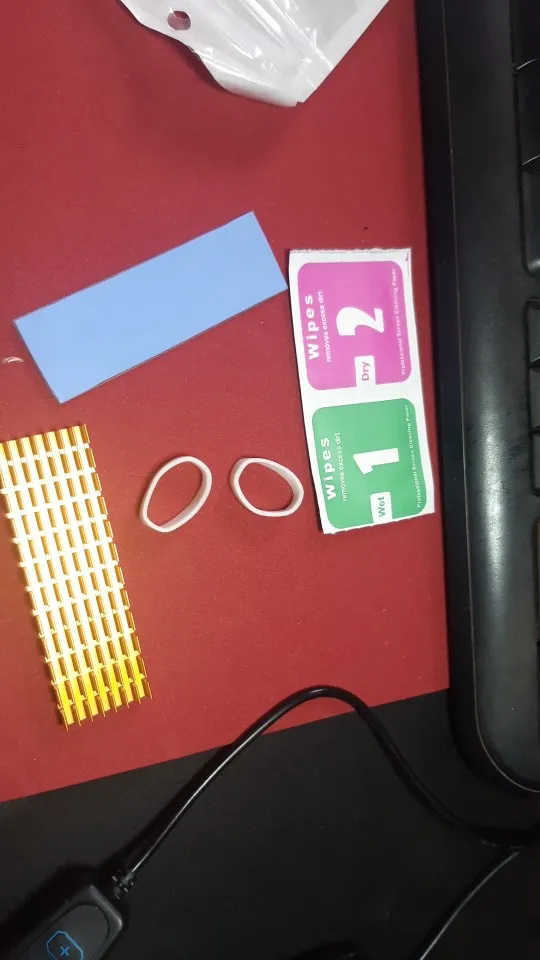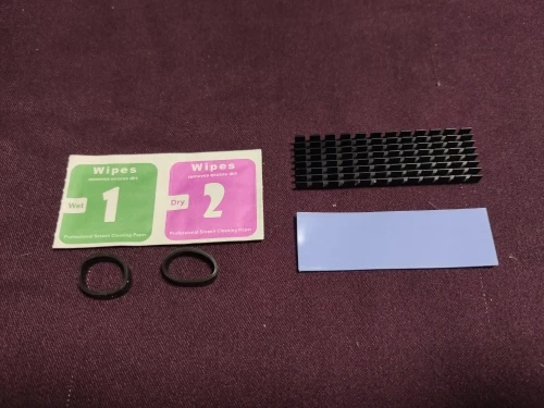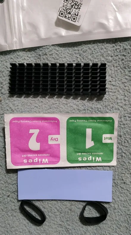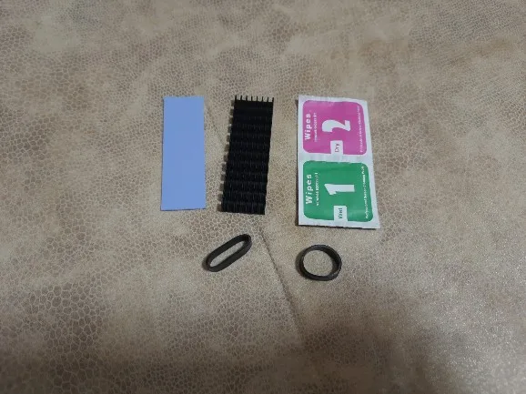 Доставка за месяц. Все как в описании. Кусочек металла, термопрокладка и 2 резинки.