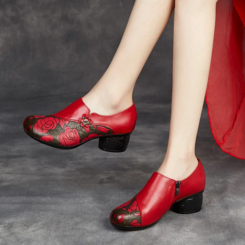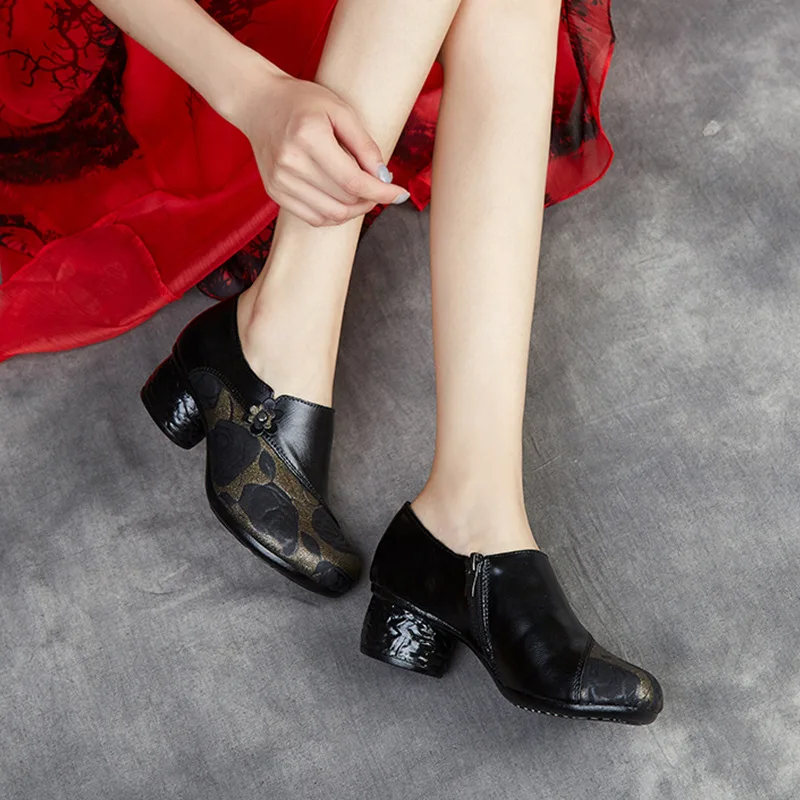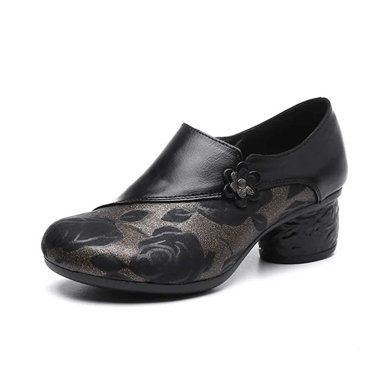 Женские туфли-лодочки из натуральной кожи, туфли из натуральной кожи с круглым носком и цветочным принтом, на толстом каблуке, большой размер 41, весна-осень 2022