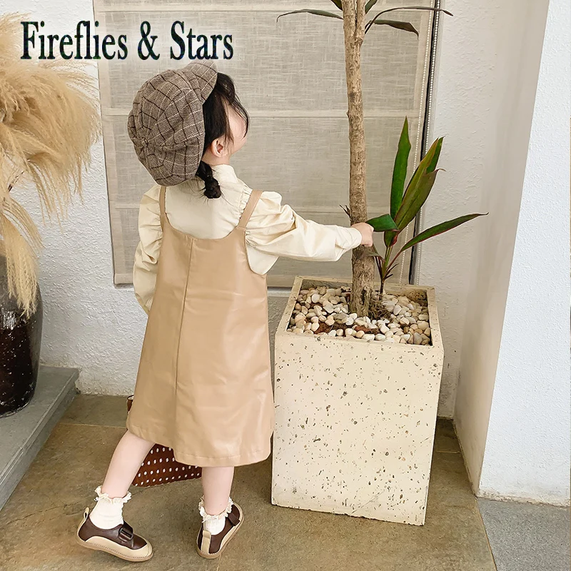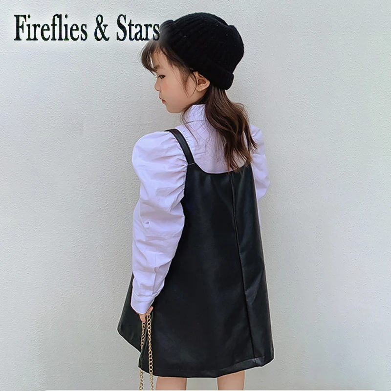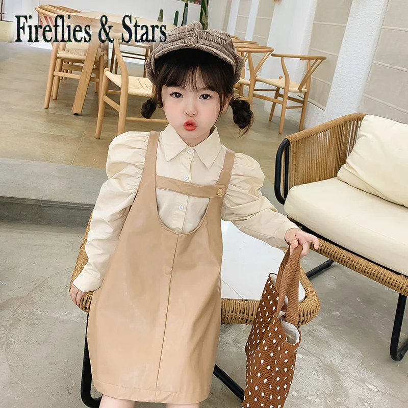 Название:Весенне-осенний комплект из 2 предметов для девочек, блузка для малышей + платье из искусственной кожи, детские костюмы, детская модная одежда, плиссированные пышные рукава, на бретелях, для детей от 2 до 9 лет