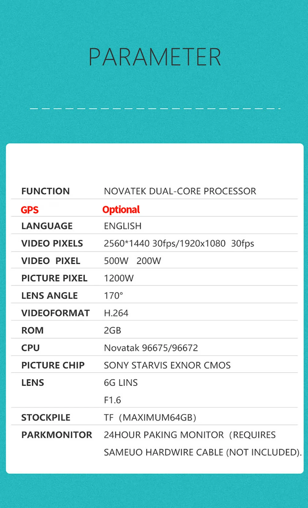 Особенности:* Встроенный GPS (опционально)* Функция: двухъядерный процессор NOVATEK* Язык: английский, тайский, русский, португальский, японский, украинский.* Видео Piels: 2560*1440 30 кадров в секунду* Видео пиксель: 500 Вт 200 Вт* Пиксель изображения: 1200 Вт* Анализ угла объектива широкоугольного объектива с диагональю 170 °.* Видеоформат H.264* ОЗУ 2 Гб* Чип изображения: SONY Starvis Exmor CMOS* Хранение TF (максимум 64 Гб). Используйте sd-карту Sameuo.* PARKMONITOR: 24 часа в сутки упаковочные монитор (требуется SAMEUO проводной кабель (не указана)
