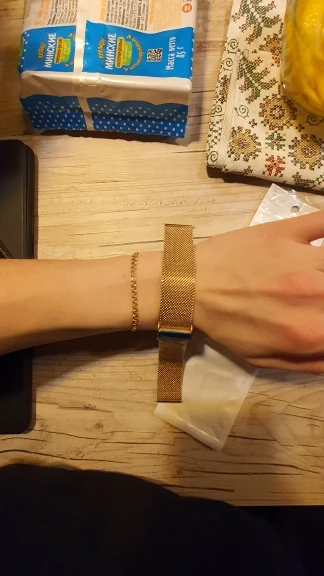К часам браслет подошёл, но к качеству есть замечание. Небольшая часть браслета имеет ограниченную эластичность. Надеюсь, что со временем разносится и браслет сядит по руке. В целов ремешок с часами смотрится очень гармонично.