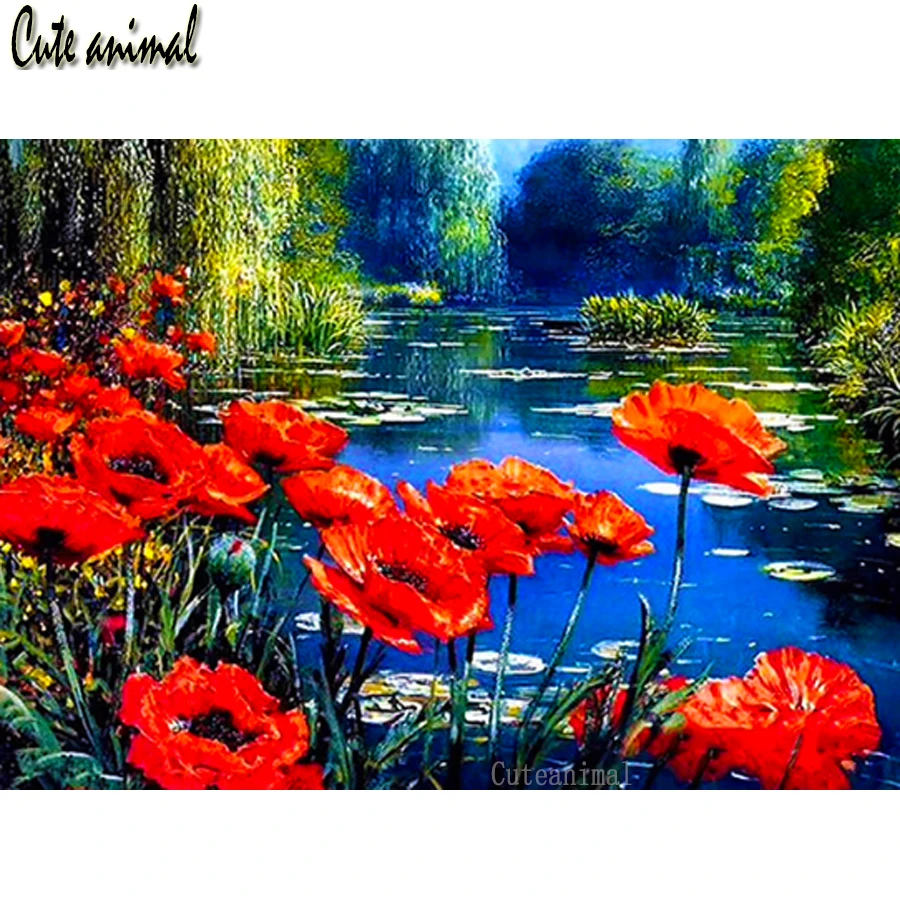 5D алмазная живопись Мак озеро красный цветок украшение искусство Вышивка крестом полный квадрат круглая дрель Алмазная вышивка искусство